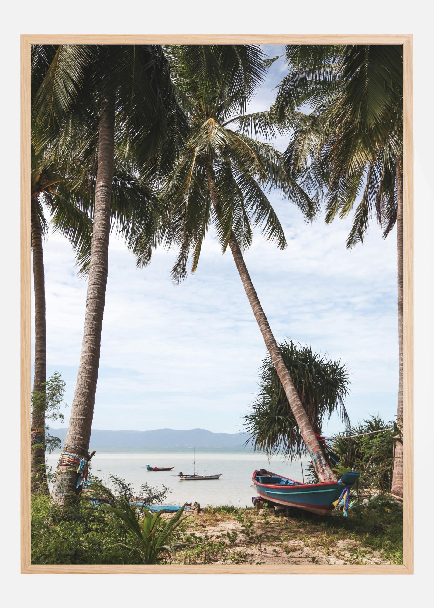 Um cartaz de férias com palmeiras e barcos na Tailândia. Duas palmeiras se inclinam uma contra a outra, enquadrando o mar atrás onde dois barcos estão ancorados. Um terceiro barco vermelho e azul está na terra, chamando a atenção. Imagine-se na praia enquanto olha para esta imagem tranquila.