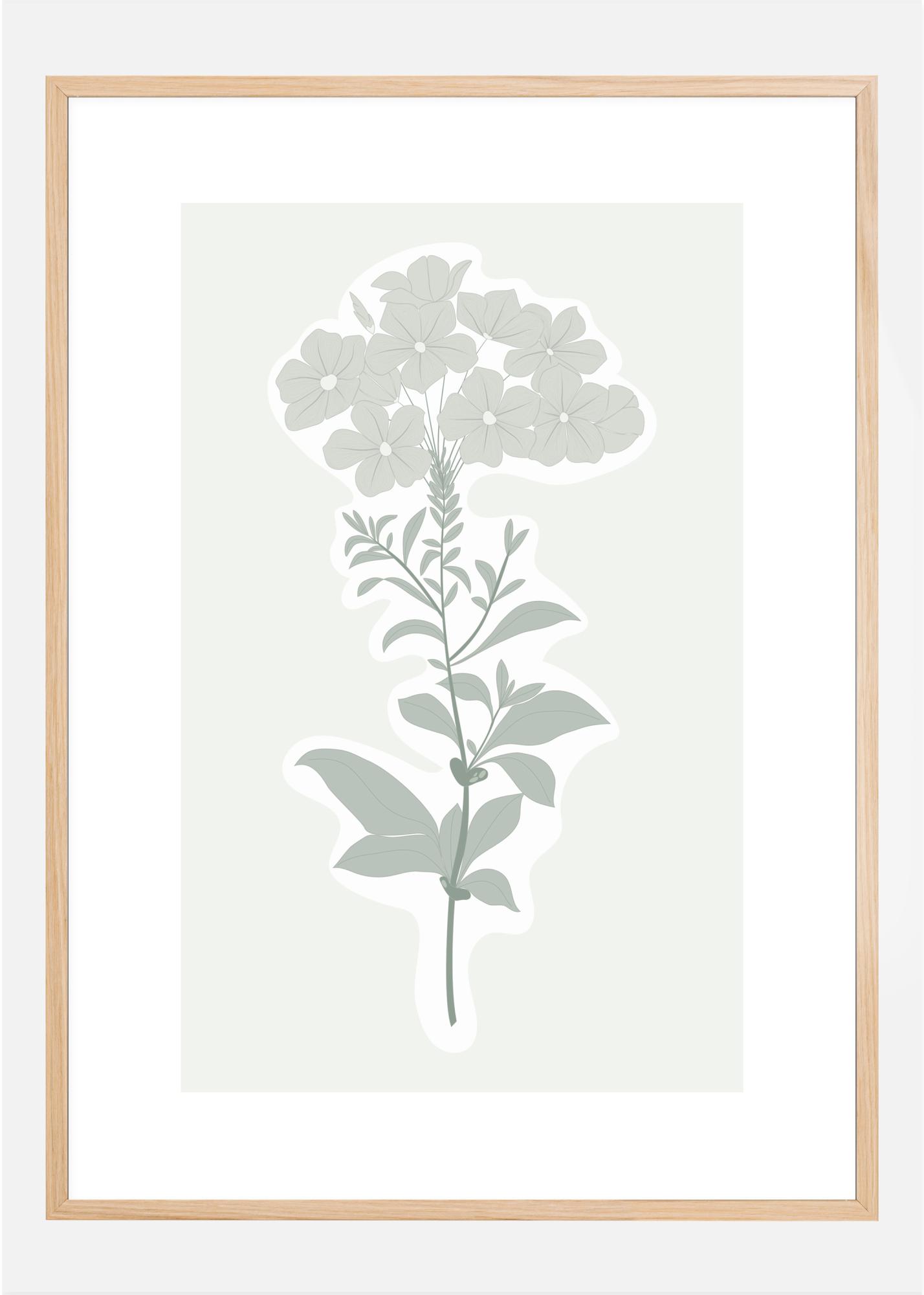 Um póster com uma simples impressão botânica de uma flor e suas folhas. Cores suaves de cinzento-verde compõem este caule simples, mas elegante, com flores. Emoldurado em branco e cinzento, esta impressão traz à vida memórias de ilustrações botânicas antigas. Mostre um pedaço do seu jardim com a ajuda desta encantadora impressão.