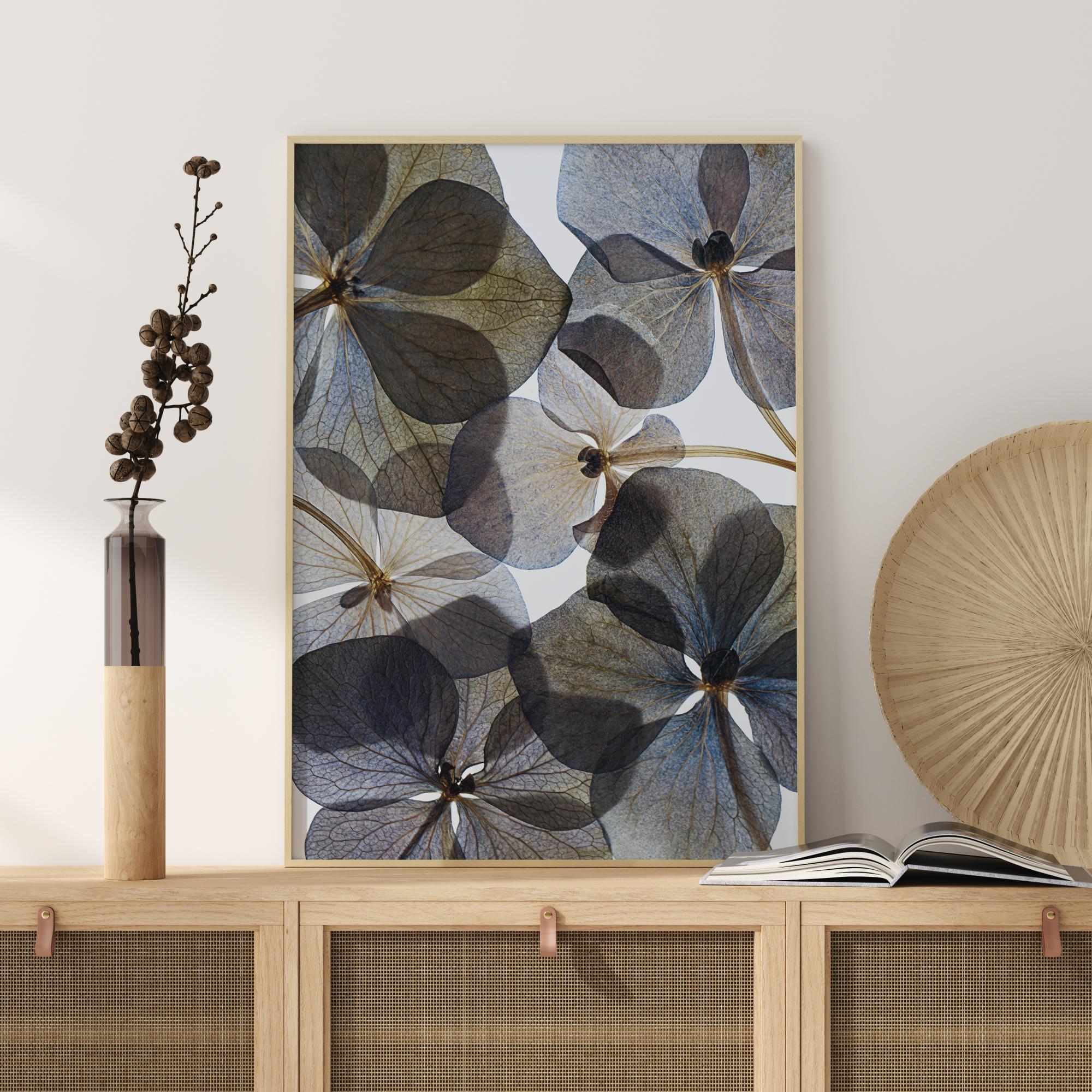 Um póster botânico cheio de flores azuis e marrons transparentes. A luz branca do fundo brilha dessas pétalas, algumas das quais se sobrepõem umas às outras, tornando-se mais escuras. Pendure esta obra e imagine-se debaixo dessas pétalas largas e maravilhosas, cercado por uma atmosfera tranquila.