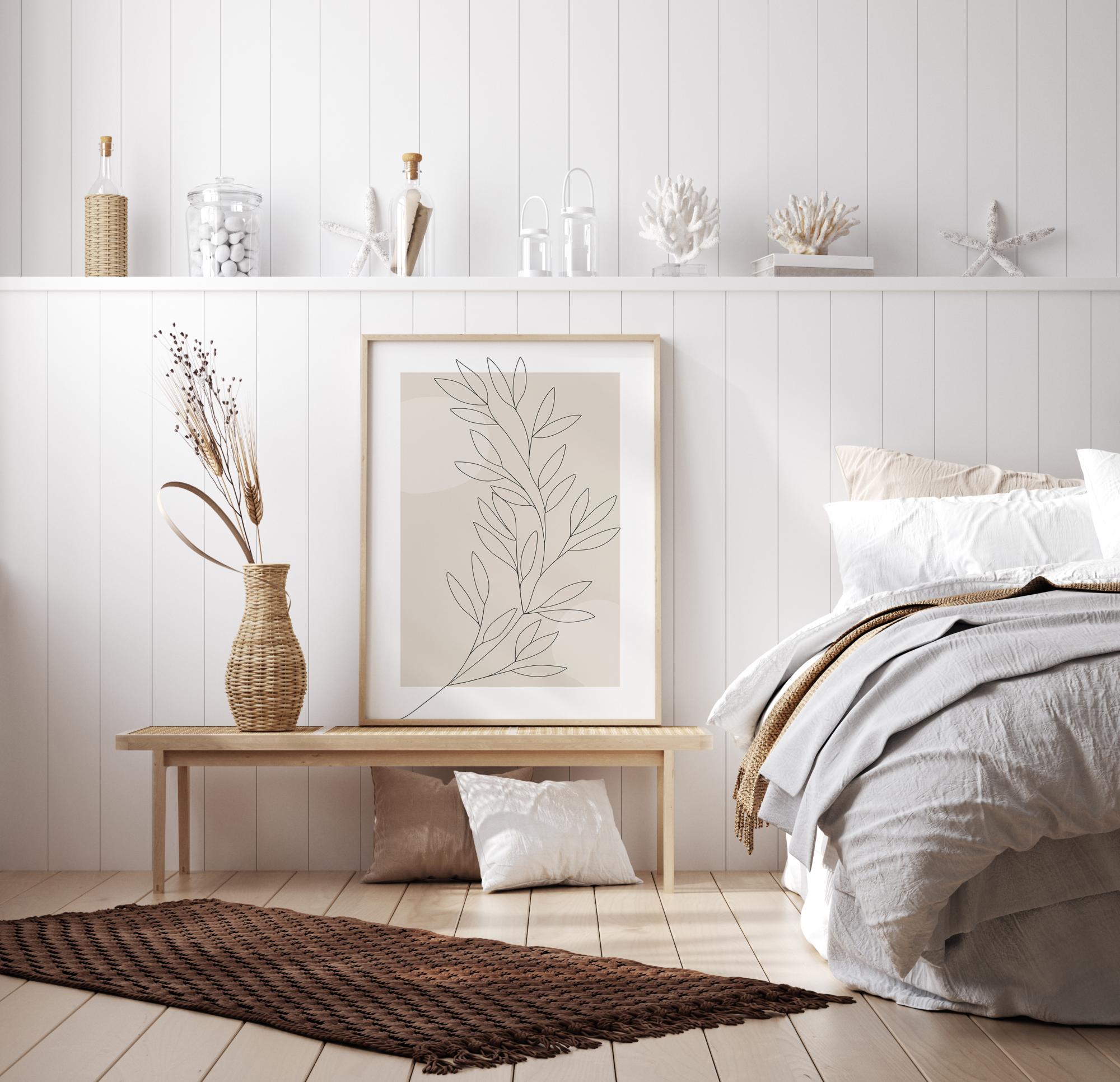 Uma simples impressão de folhas num fundo cinzento. Siga a curvatura do desenho simples e deixe o olhar ser guiado ao redor da imagem. Um círculo cinzento claro representa o sol nesta obra tonal em tons de cinzento. Pendure-a num fundo claro para dar cor e vida a esta obra.
