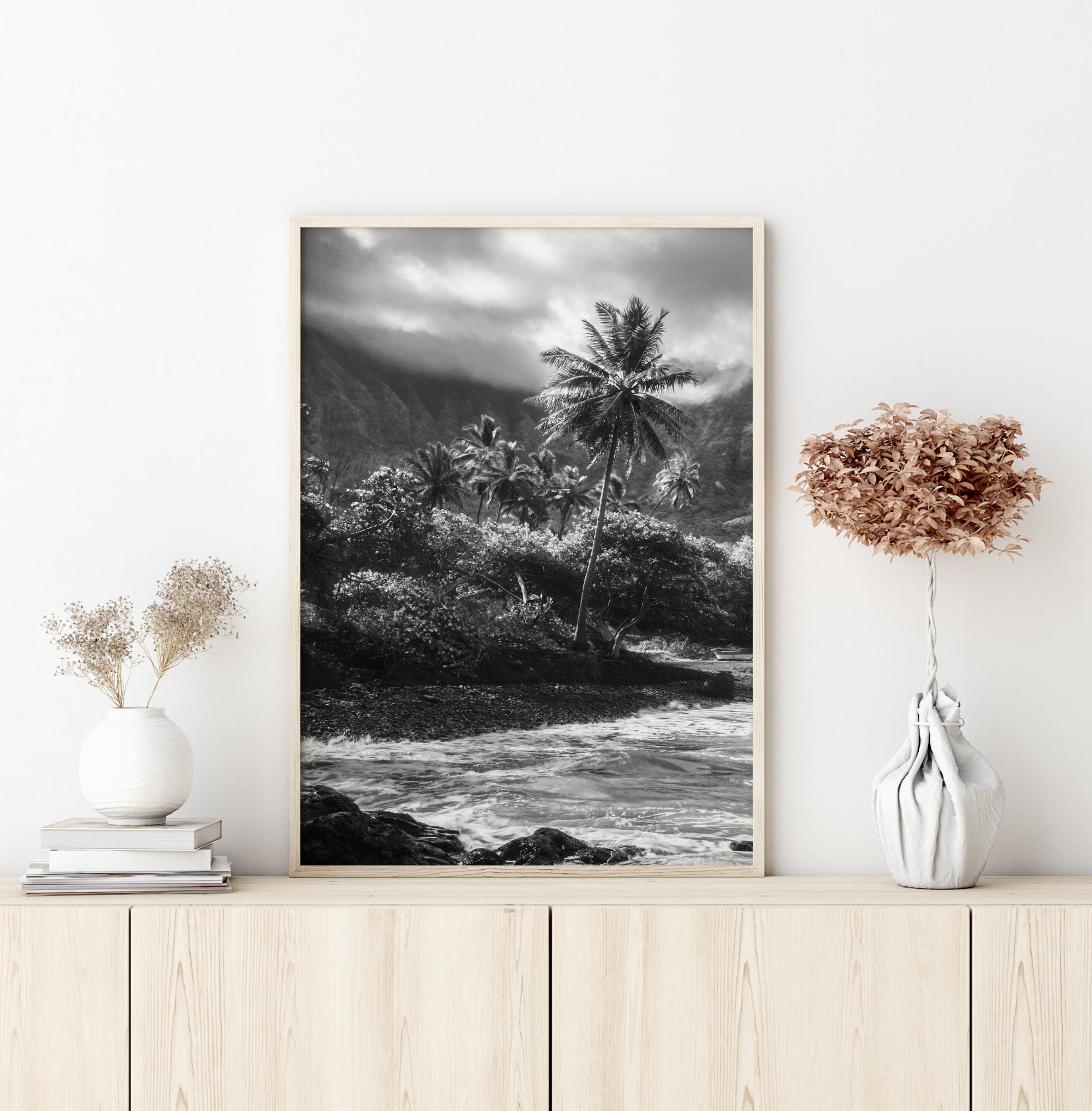 Um póster de natureza com uma tempestade se aproximando onde o mar encontra a terra. Um céu nublado sombreia a foto enquanto as palmeiras balançam ao vento. Um mar espumante encontra a praia rochosa para um efeito extra. Crie um pouco de drama em casa com esta obra em preto e branco numa parede neutra.
