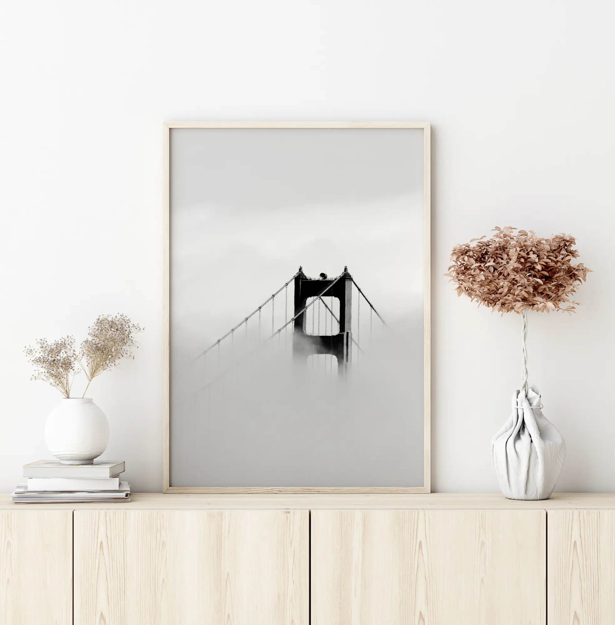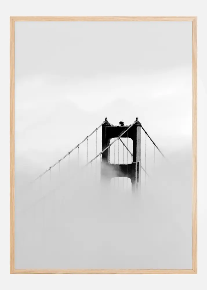 Um póster llamativo com o topo de uma ponte. A névoa sobe e esconde toda a ponte, exceto o topo. Preta e sólida, a ponte se eleva entre o céu nublado acima e a névoa abaixo. Aproveite esta imagem incrível quando tiver este póster na parede.