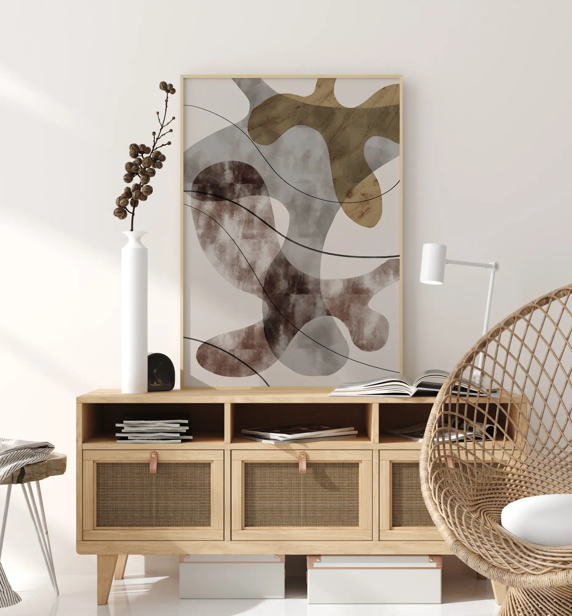 Um póster abstrato com cores e diferentes formas e linhas. Três formas principais em amarelo, vermelho e cinzento que parecem respingos de tinta preenchem a imagem. Quatro linhas onduladas pretas giram ao redor delas. Pendure esta obra em sua parede e faça sua casa parecer uma galeria.
