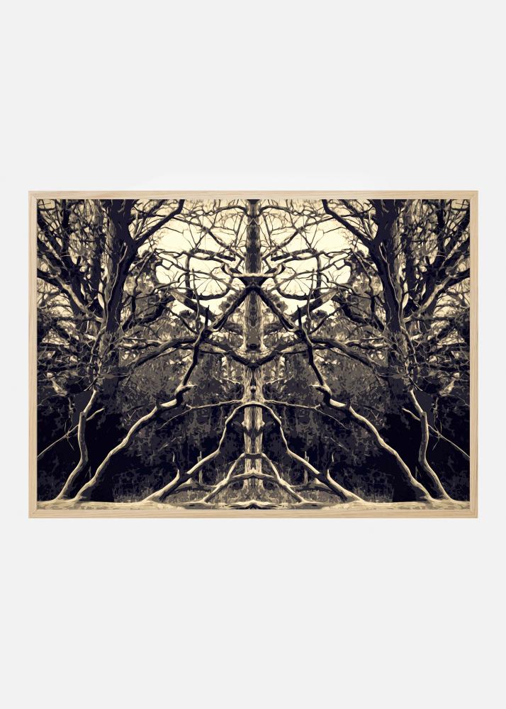 Um incrível póster caleidoscópico com árvores e galhos. A imagem da natureza refletida cria um póster fascinante onde é possível ver todos os tipos de rostos e formas. Os tons sépia claros nesta imagem combinam com cores pastel para uma sensação mais suave em contraste com a complexidade da imagem.