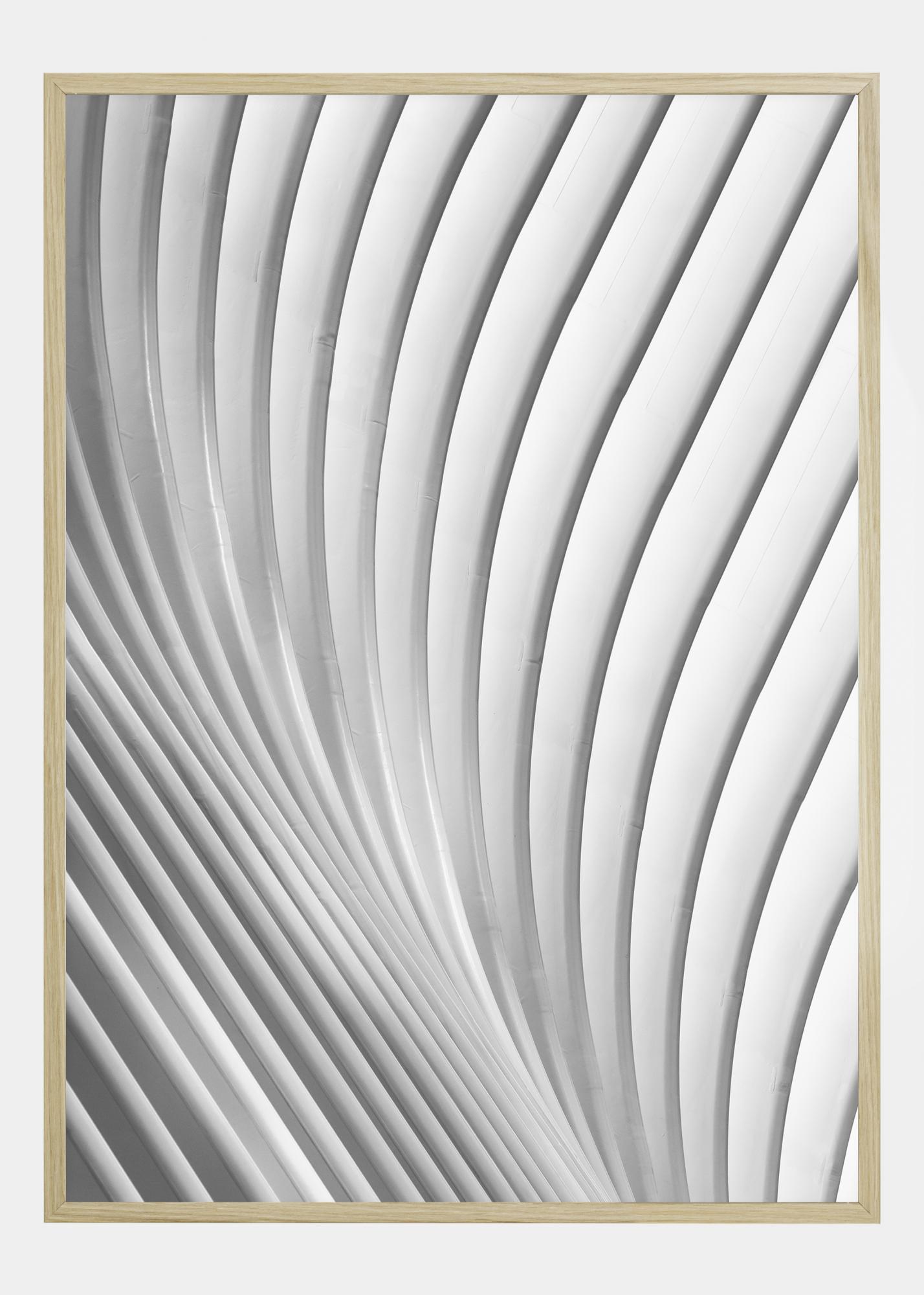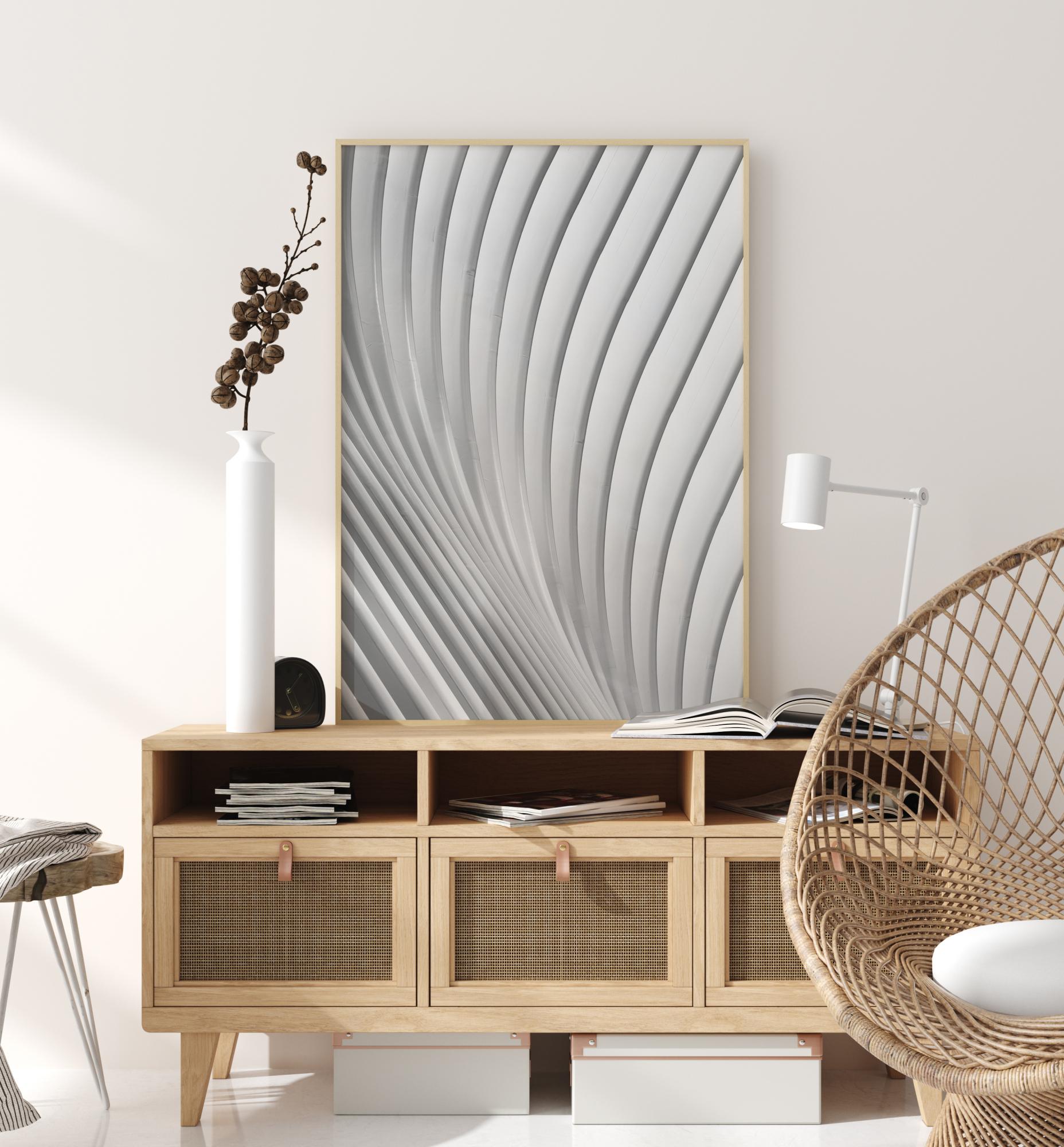 Um póster abstrato com linhas brancas e cinzentos ondulantes sobre a imagem. As linhas começam no canto inferior direito e se curvam suavemente para cima antes de virar para a direita. Embora simples, esta imagem atrai a atenção quando permite que o seus olhos relaxem e sigam as linhas.
