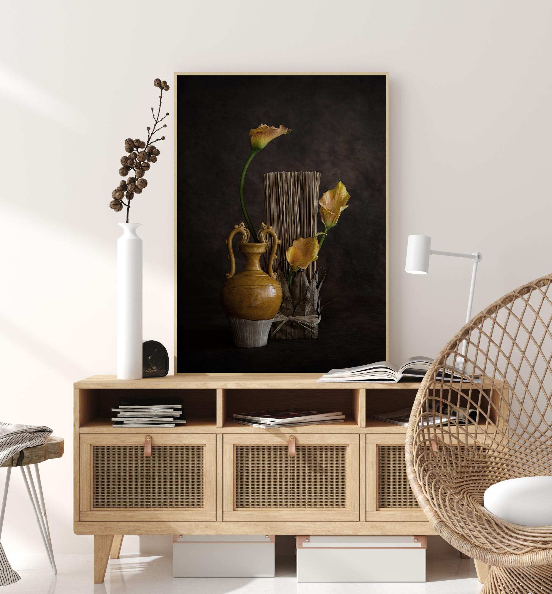 Um póster de natureza morta com uma jarra, caules marrons secos e três flores de lírio. Um fundo preto destaca a jarra cor de mostarda e os três lírios amarelos. Um lírio se curva em direção ao topo e guia o olhar ao redor da obra. Pendure isso para adicionar um toque de elegância à sua casa.
