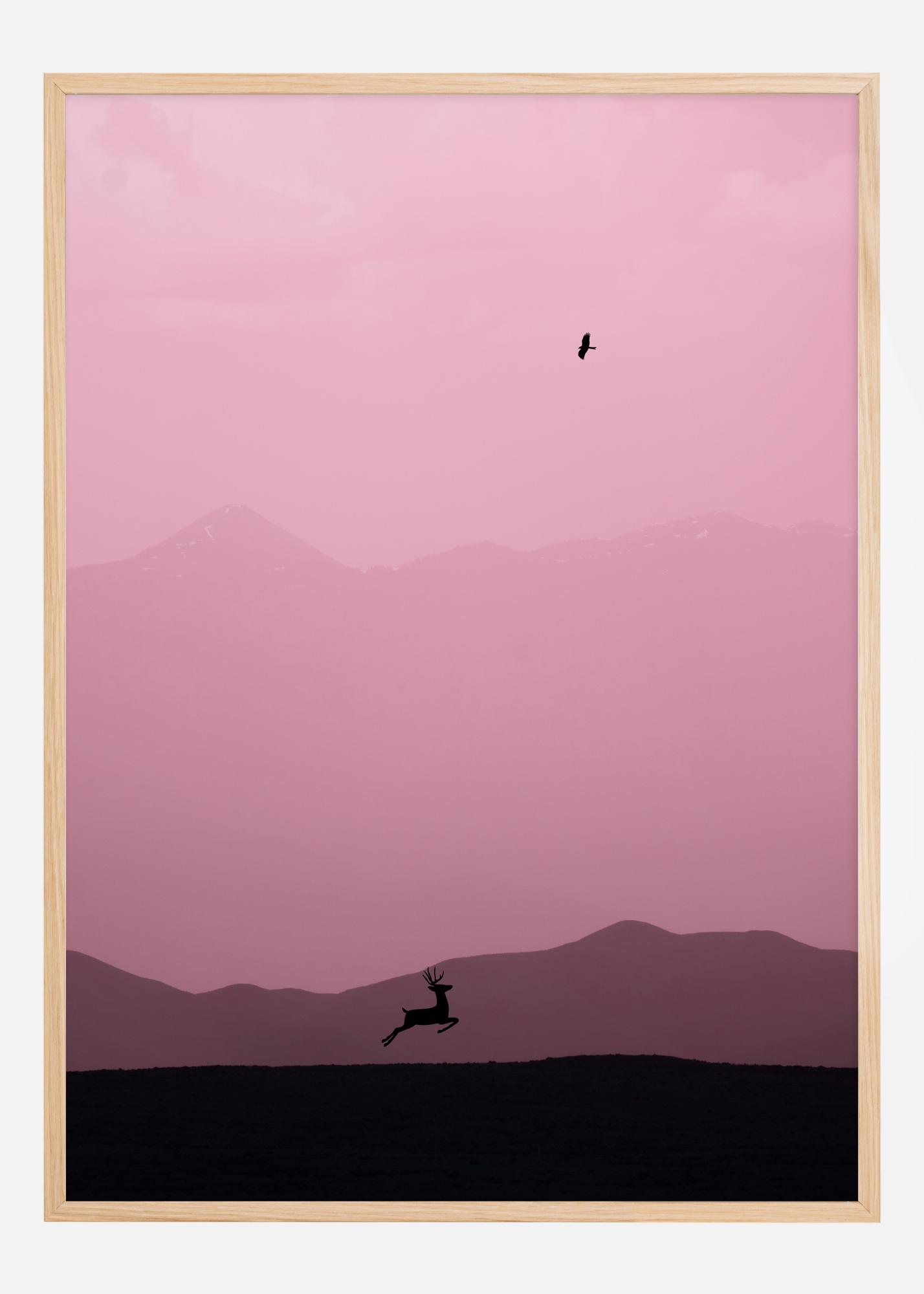 Este pôster tranquilo e sonhador captura a essência da liberdade e beleza da natureza. Uma silhueta de um cervo capturada em um salto sobre a silhueta de colinas suavemente onduladas dá uma sensação de movimento e leveza. Acima de tudo, estende-se um céu suavemente rosa que adiciona uma sensação de calor e maravilha. Um pássaro solitário voa em direção à infinitude do céu, o que adiciona uma dimensão extra de liberdade e ausência de amarras à imagem.