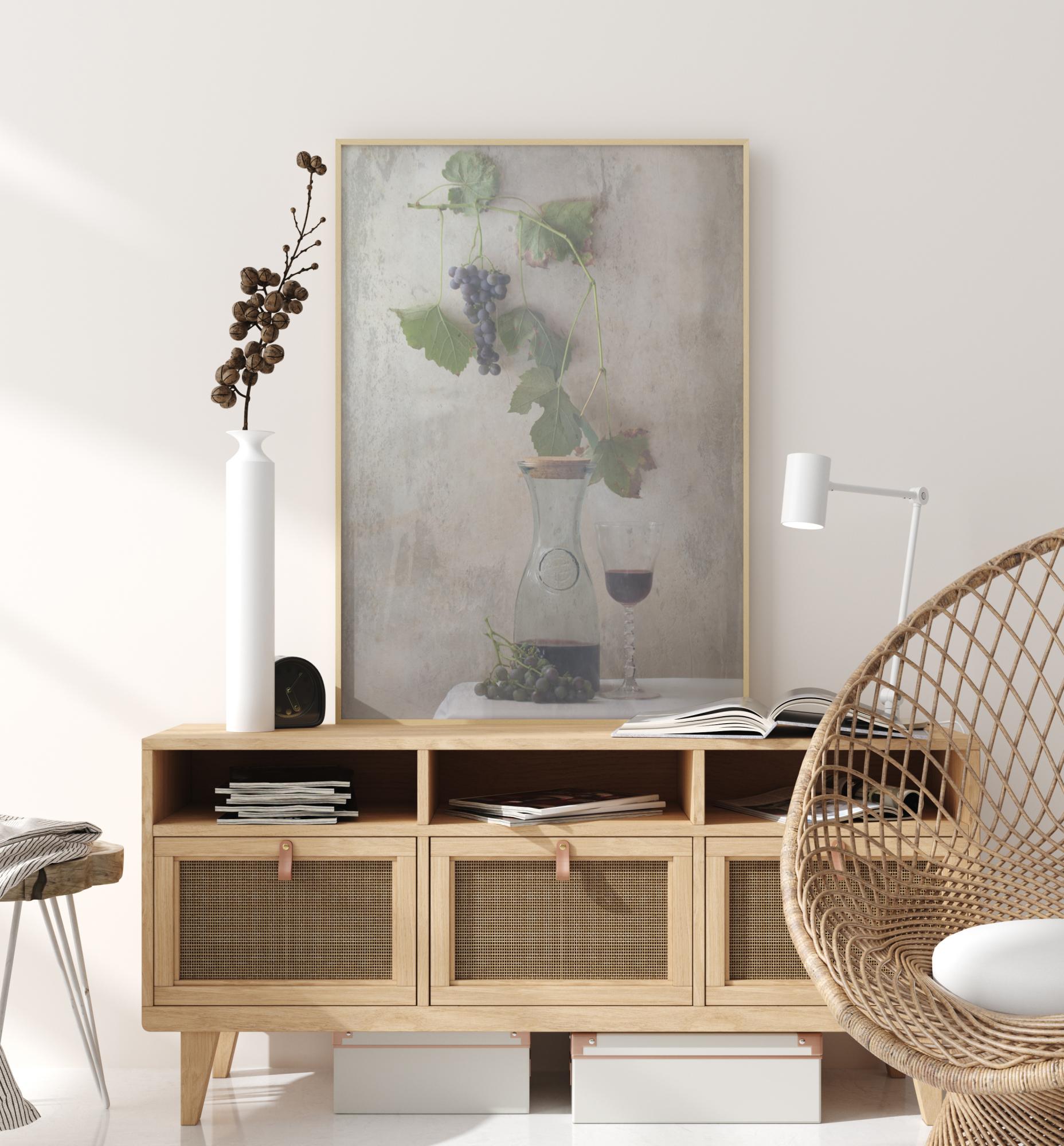 Um póster de natureza morta com uma jarra de vinho caseiro, copo de vinho e um pequeno ramo de uvas. As uvas roxas escuras e as folhas verdes estão numa parede cinzento simples, o que as destaca. Transporte-se para uma vila romana quando tiver essa obra elegante, mas simples, pendurada em casa.