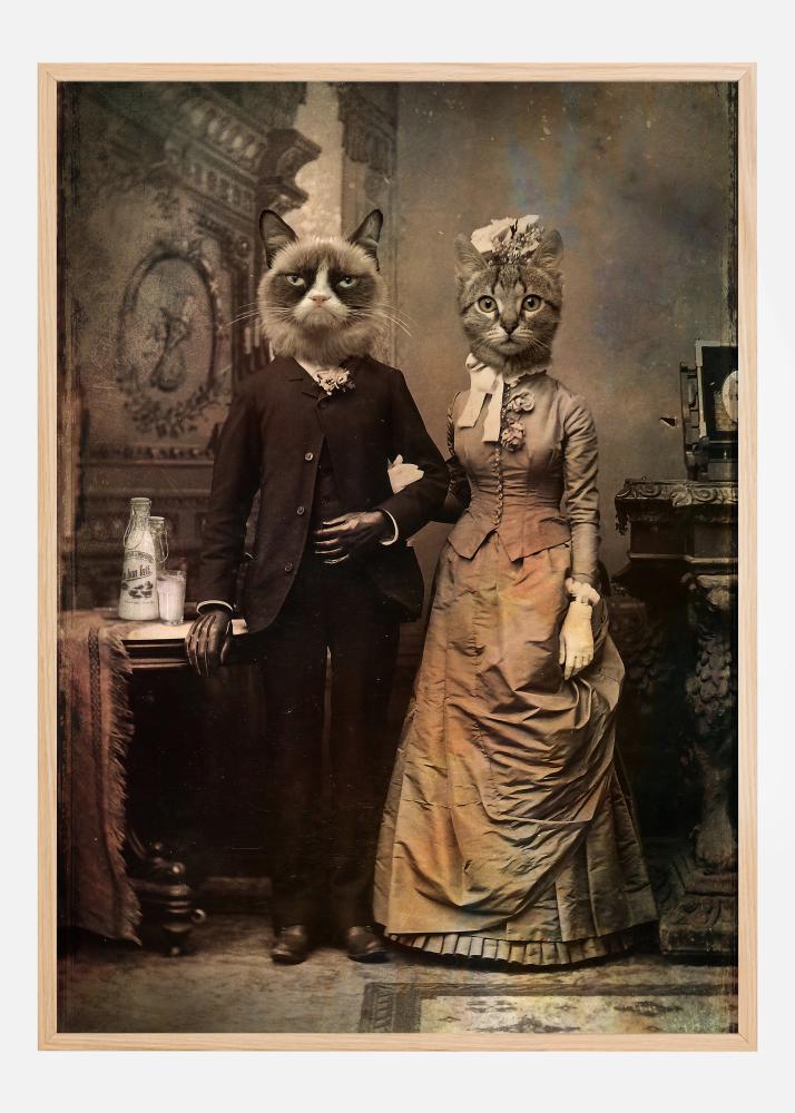 Um póster cômico que mostra um casal de gatos vestidos com roupas vitorianas. O gato mal-hulila e sua noiva estão vestidos no estilo vitoriano completo, incluindo terno e espartilho nesta impressão sépia. Traga um pouco de riso para sua casa com essa imagem na parede da sua sala de estar.