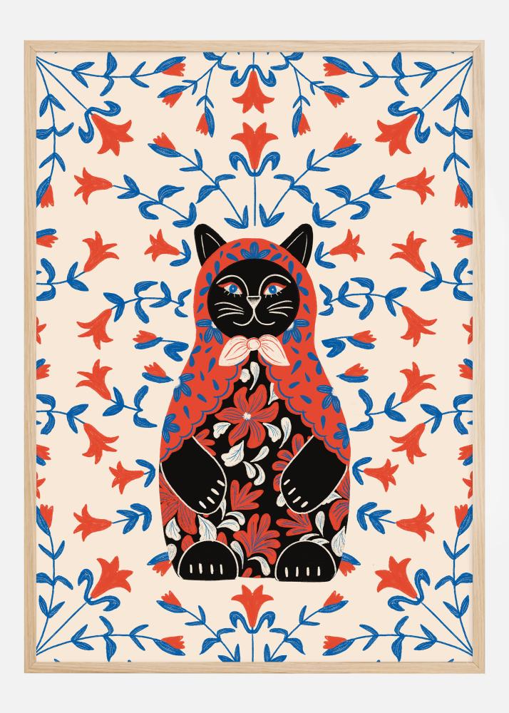 Este pôster colorido e vibrante é uma interpretação moderna da clássica matriosca russa, reinterpretada como uma majestosa figura de gato que se senta no centro, cercada por um exuberante jardim de flores. O olhar do gato é penetrante e misterioso, enquanto seu pelo é ricamente adornado com padrões florais intrincados. Ao redor do gato, um mar de flores vermelhas e azuis se espalha contra um fundo creme, criando um padrão quase hipnotizante que é tanto cativante quanto bonito.