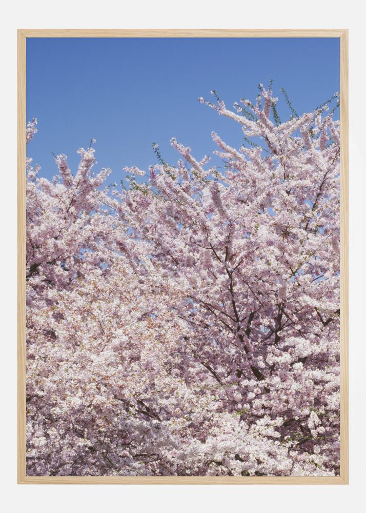 Um póster de natureza com árvores de cerejeira fantásticas com flores brancas contra um céu azul claro. As flores brancas preenchem esta imagem e contrastam fortemente com o céu. Pendure esta imagem e deixe a sua casa ser preenchida com uma sensação de natureza quando olhar esta obra em sua parede.