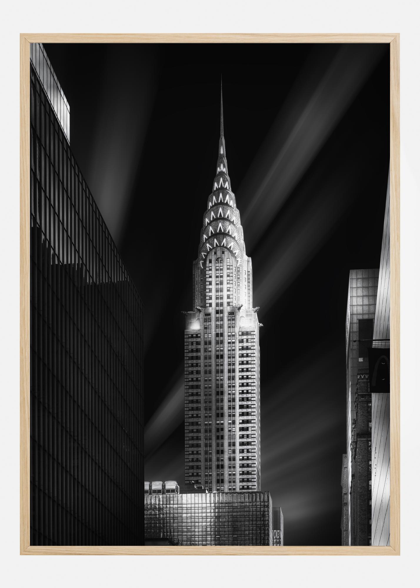 Um póster noturno com o edifício iluminado da Chrysler em Nova Iorque. O edifício está contra um céu negro no meio da foto. Raios de luz branca sobre o céu criam ângulos e drama. Faça uma declaração audaciosa com esta foto dramática em preto e branco.