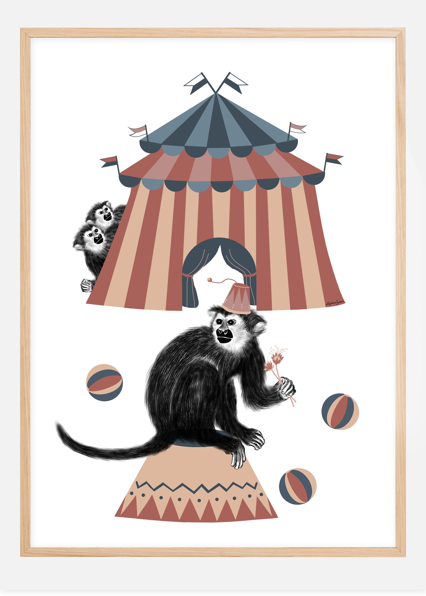 Um póster divertido com macacos de circo e uma tenda de circo. Um macaco está sentado em um banquinho usando um fez e segurando flores. Três bolas estão no chão. Mais dois macacos estão se escondendo atrás da tenda de circo. Dê ao seu lar uma dose de diversão com essa imagem numa parede.