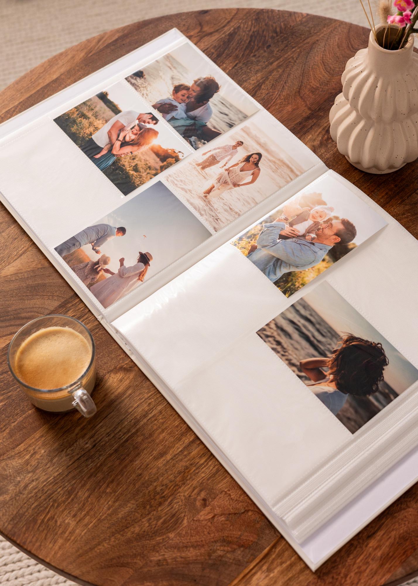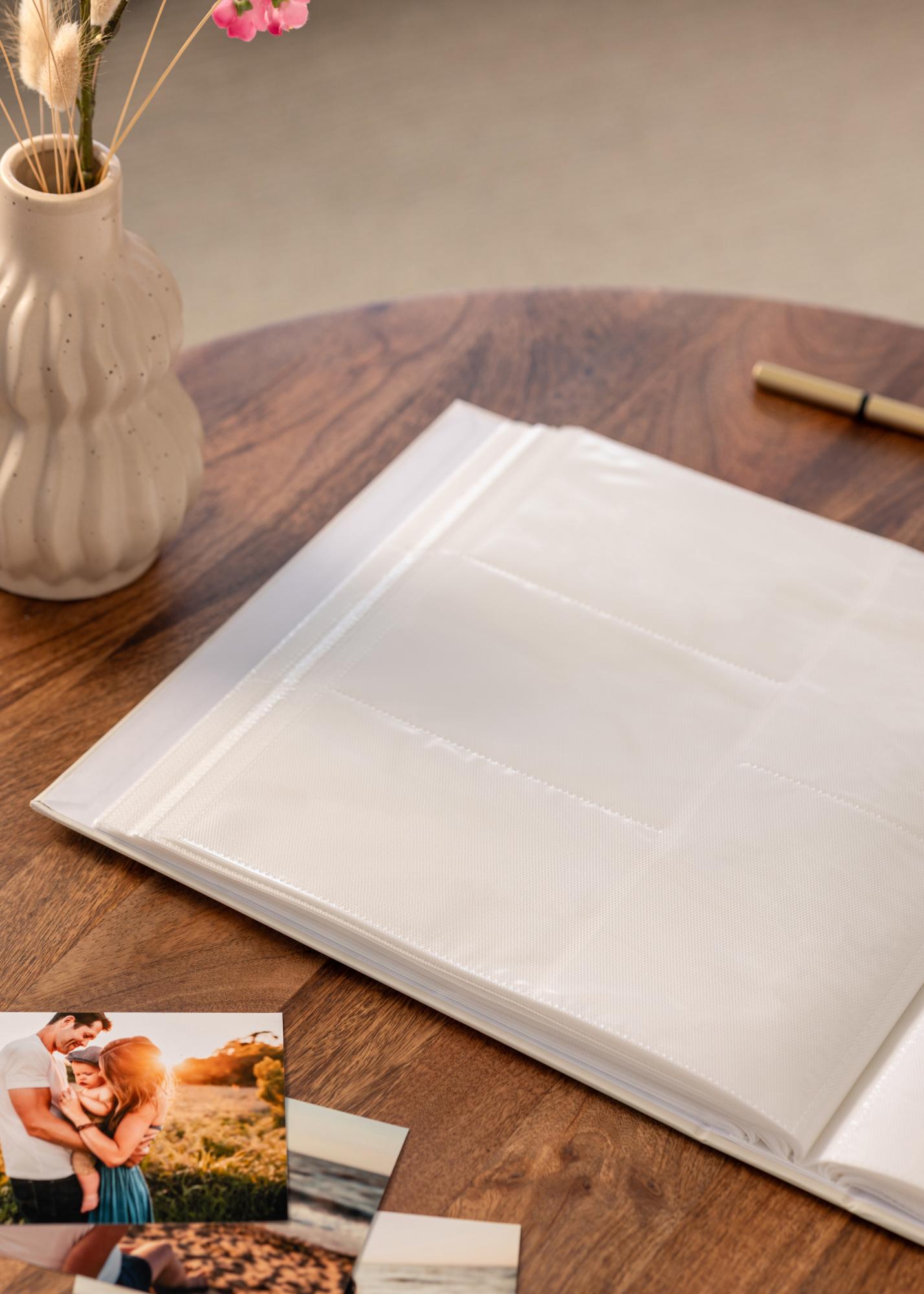 As capas do álbum são em um tom cinza sofisticado que proporciona uma impressão intemporal e moderna. As páginas brancas criam um belo contraste e destacam suas fotos da melhor maneira. Cada página está equipada com práticos bolsos para fotos, o que torna fácil montar e trocar fotos sem complicações.