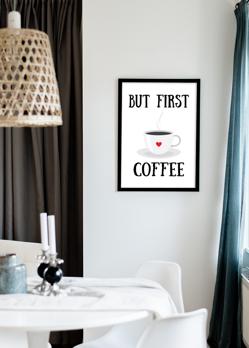 Cartaz com uma ilustração de uma chávena de café com uma mensagem para a pessoa que ama café. O doce motivo com um coração na chávena é um belo presente para oferecer e fica bem pendurado na cozinha de uma decoração rural ou inspirada no retro. Complete o póster com uma moldura que combine com o estilo da ilustração e da decoração em geral para criar uma sensação de unidade na casa.