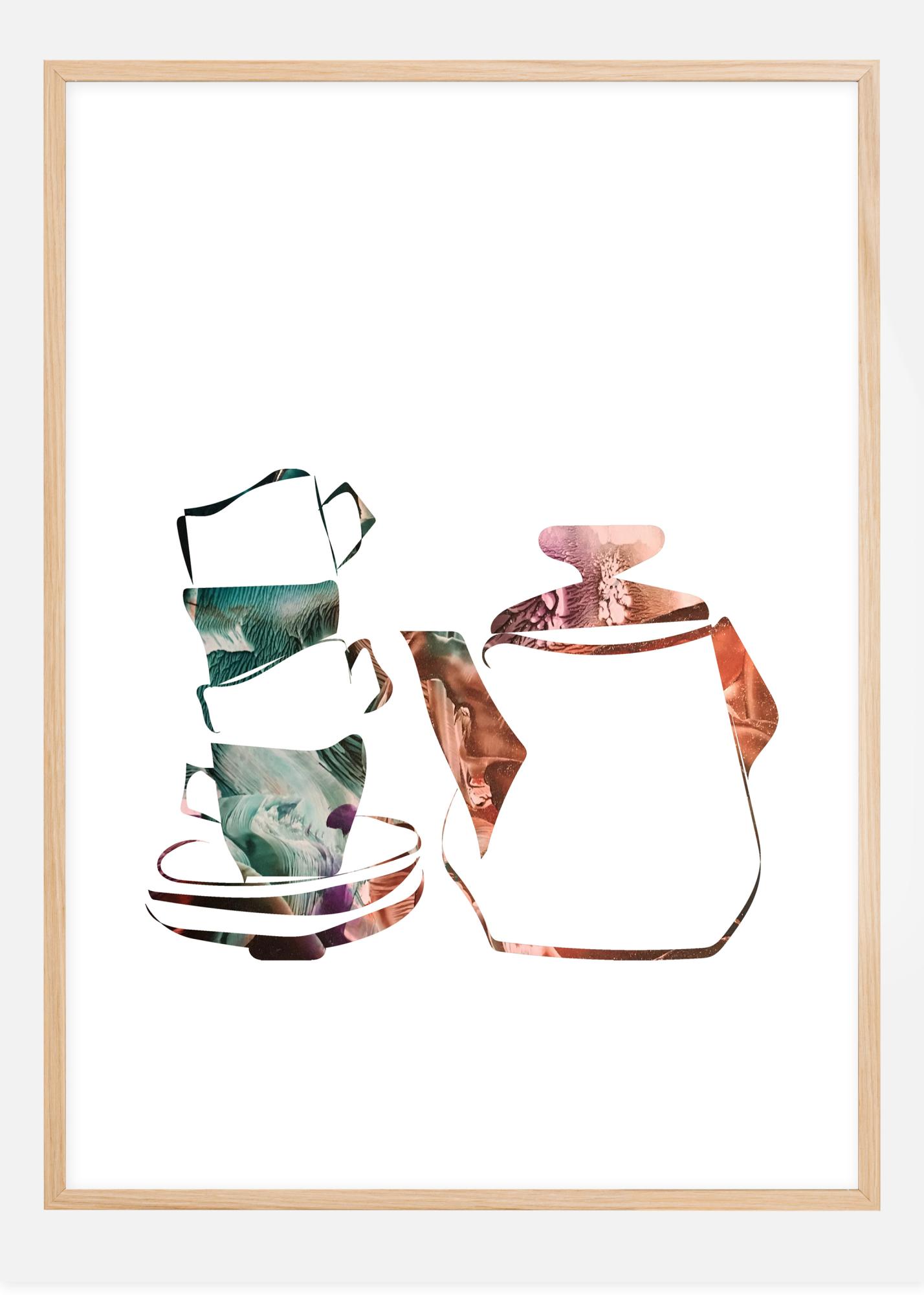 Um póster abstrato com café e chá, bem como chávenas, pratos e uma jarra. Cada um é feito de campos marmorizados abstratos em turquesa e laranja num fundo branco. Prepare-se para a sua bebida quente favorita enquanto você olha para esta imagem todas as manhãs.