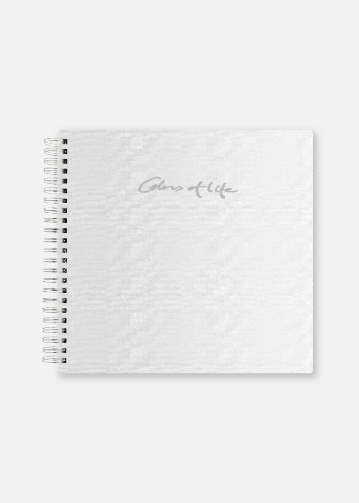 Um álbum em espiral de 24x23 cm com 24 páginas brancas sem ácido, pronto para ser preenchido com memórias! Na capa do álbum está escrito "Cores da vida" em prata.