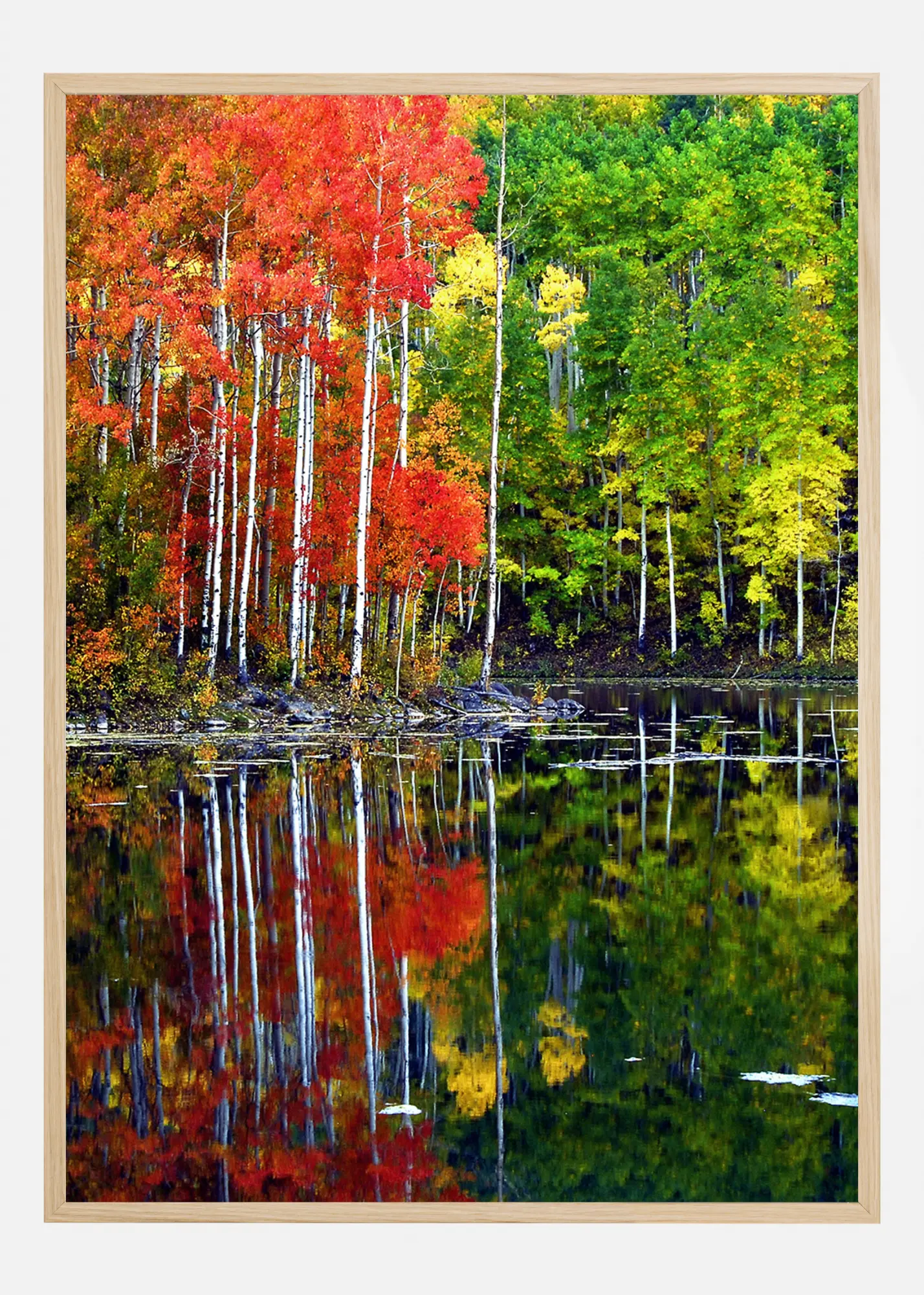 Um póster claro com um lago cercado por árvores. Primavera e outono se encontram nesta imagem colorida com folhas vermelhas à esquerda e verde à direita. Todos lançam um reflexo claro na água do lago em uma cena tranquila, mas ainda assim vívido. Traga a alegria da natureza para sua casa com a ajuda desta impressão.