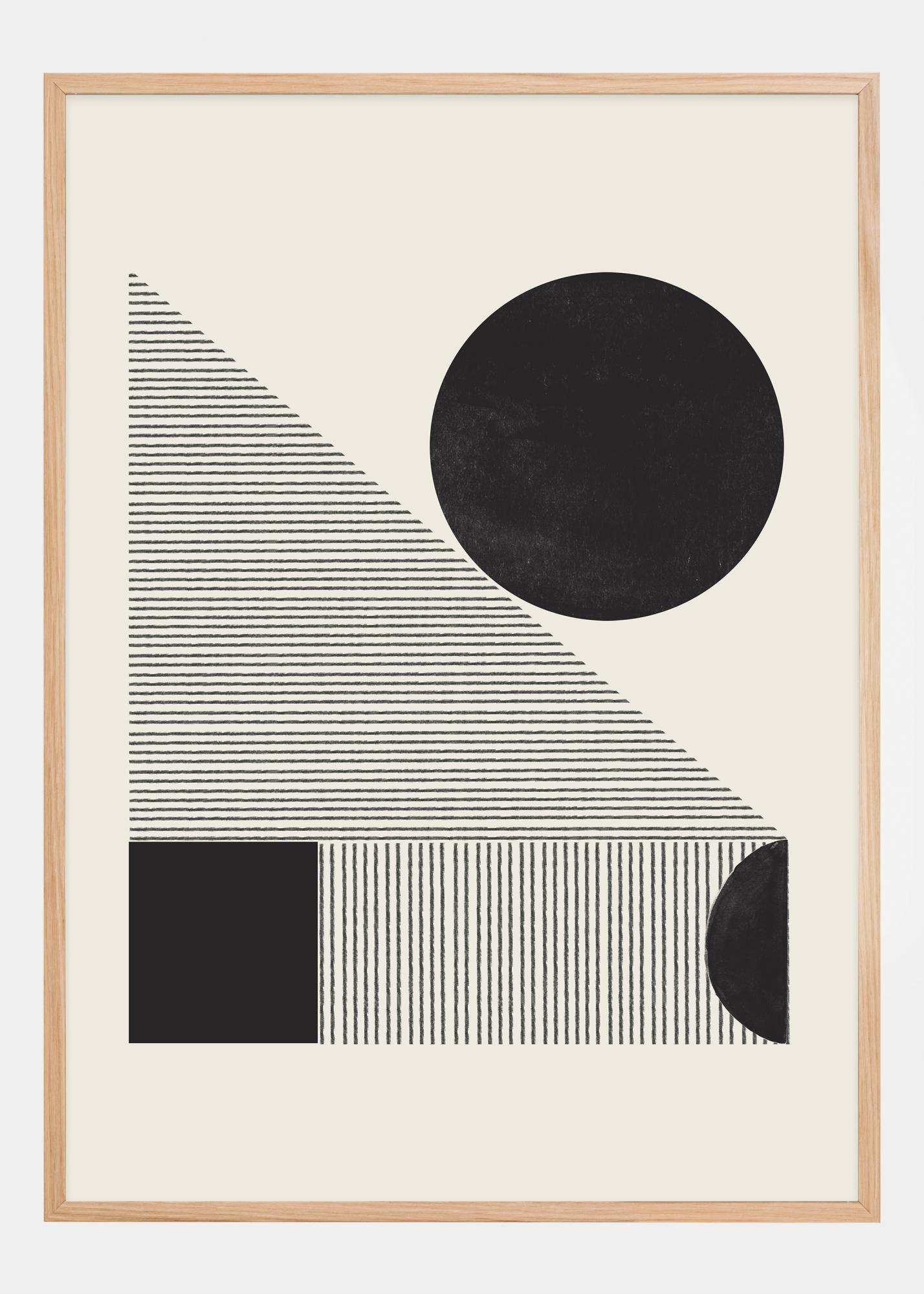 Este cartaz é uma interpretação lúdica e sofisticada da abstração geométrica. Linhas pretas e brancas interagem em um padrão cuidadosamente equilibrado de formas, enquanto o grande círculo preto domina a parte superior da composição, criando um forte ponto de âncora visual. O jogo contrastante entre as áreas pretas pronunciadas e as linhas brancas convida o observador a explorar as diferentes texturas e profundidades da imagem.