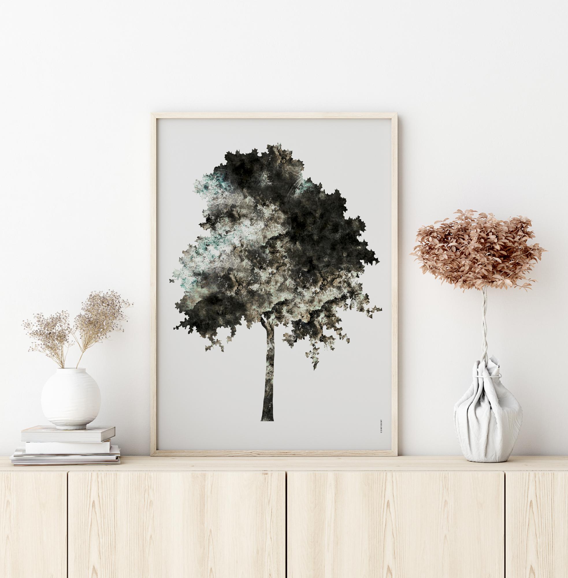 Um póster de arte gráfica na forma de uma árvore, criado pela artista gráfica Isabell Larsson, VISSLA Visuell Design. Uma tela maravilhosamente minimalista em cores harmoniosas que se adequa tanto ao corredor ou cozinha quanto à sala de estar, quarto ou biblioteca.