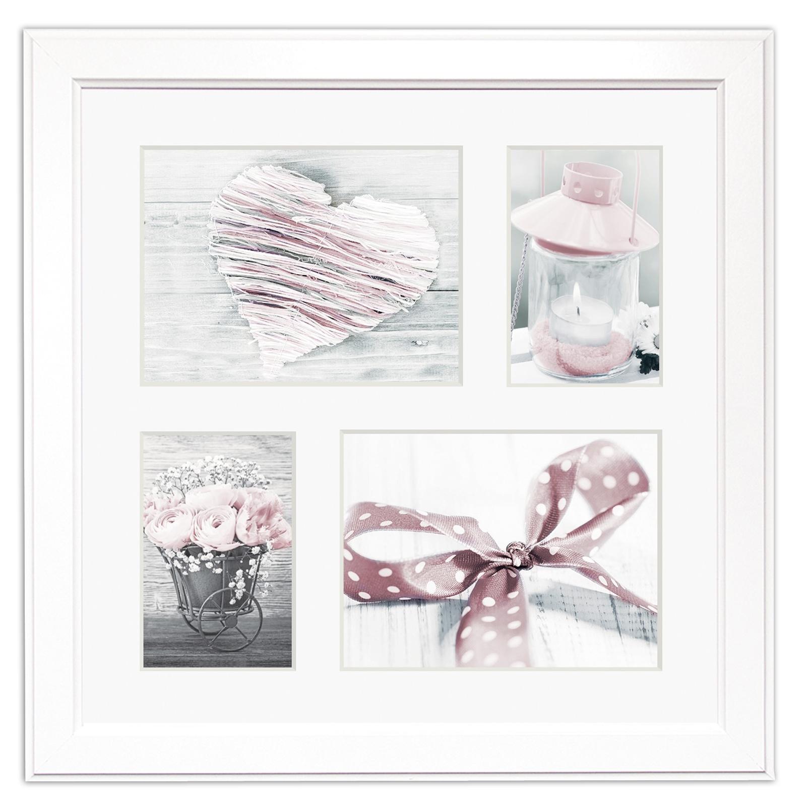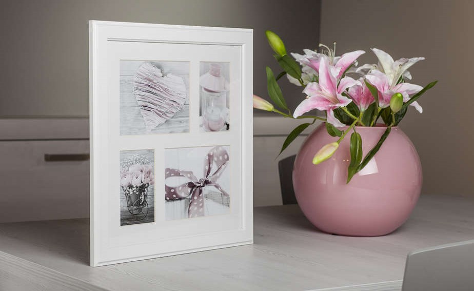 Se não consegue decidir qual foto ficou melhor na festa ou no casamento, é melhor criar uma colagem com as fotos favoritas. Aqui temos uma elegante moldura de colagem que une as imagens em uma totalidade simétrica. A moldura de foto tem detalhes luxuosos e é toda branca, o que a torna fácil de combinar. Dentro dela, há um passe-partout branco que estrutura e protege.
