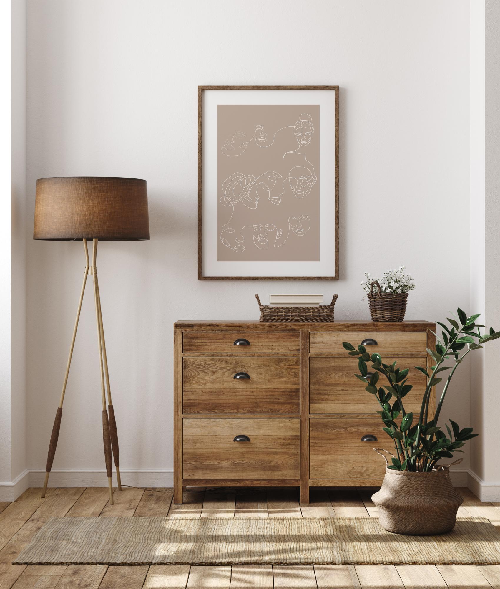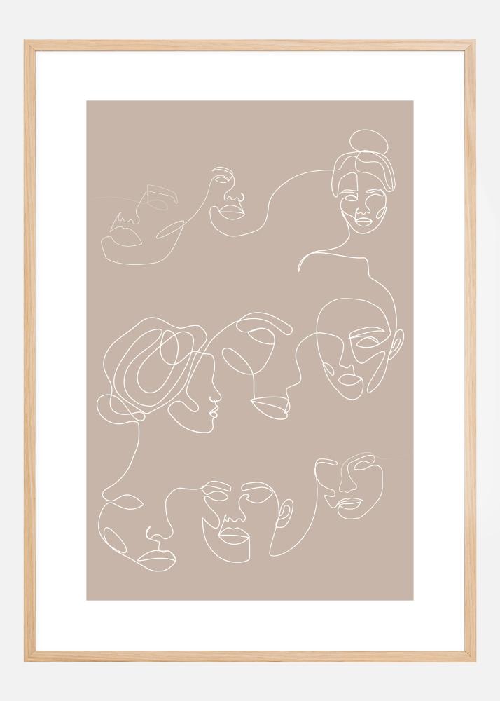 Um póster de bloco de esboço com várias cabeças e rostos abstratos desenhados. Essas cabeças abstratas foram todas desenhadas com uma única linha e estão conectadas em uma longa fileira. As linhas brancas no fundo bege funcionariam bem junto com uma parede de cor ousada para criar uma atmosfera artística adicional.