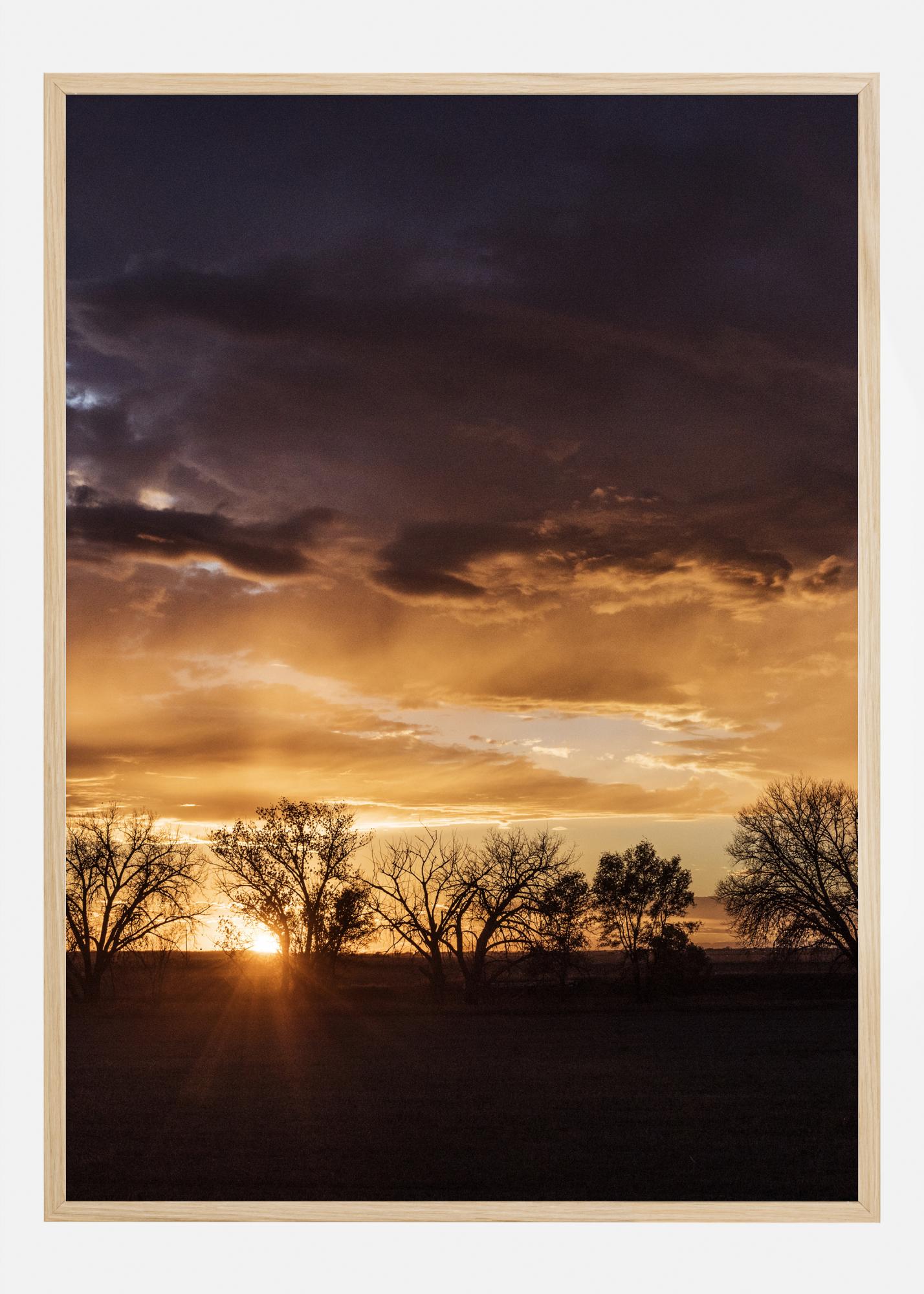 Uma pressão impressionante de um pôr-do-sol laranja. O pôr-do-sol no horizonte destaca as árvores de outono nos campos. Com um céu espetacular, os tons de laranja criam uma atmosfera quente e calmante. Um póster incrível que traz calor para a sua sala de estar.