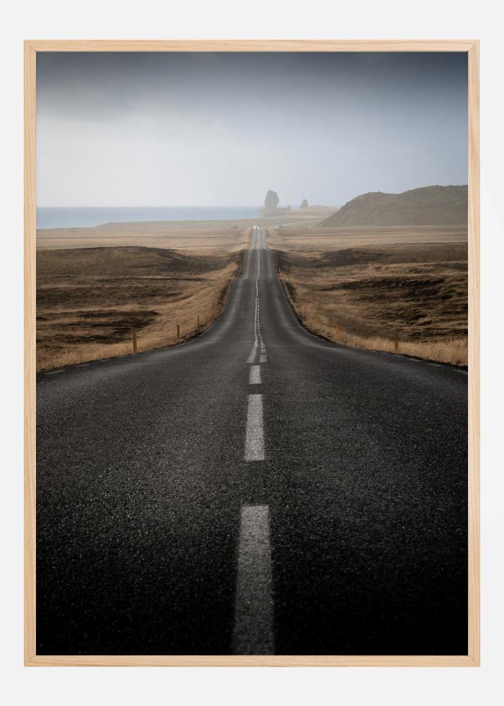 Um póster de paisagem com uma estrada que percorre o campo remoto. Uma estrada asfaltada desaparece ao longe e as linhas brancas marcam o caminho. Ao longo de ambos os lados, há campos marrons e pode ver o mar e colinas ao longe. Imagine para onde a estrada pode te levar quando essa imagem estiver pendurada na parede.