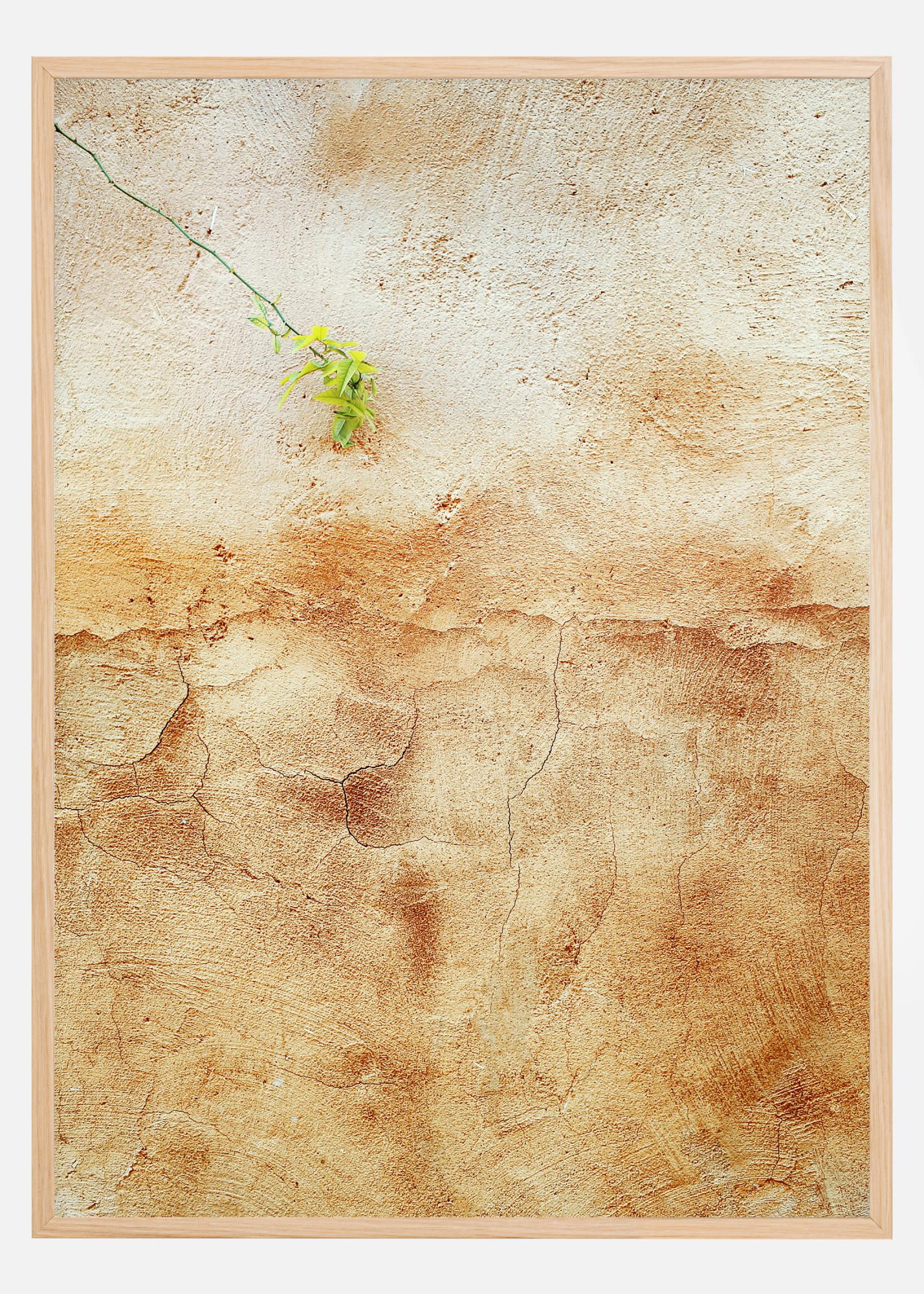 Um póster de close-up de uma parede rachada com uma pequena planta verde crescendo na rachadura. A parede marrom macia é compensada pela rachadura verde fina e pela planta clara. Deixe o olhar vagar até encontrar todas as rachaduras estranhas nesta superfície texturizada. Combine esta obra com uma parede de cor semelhante para obter o melhor efeito.