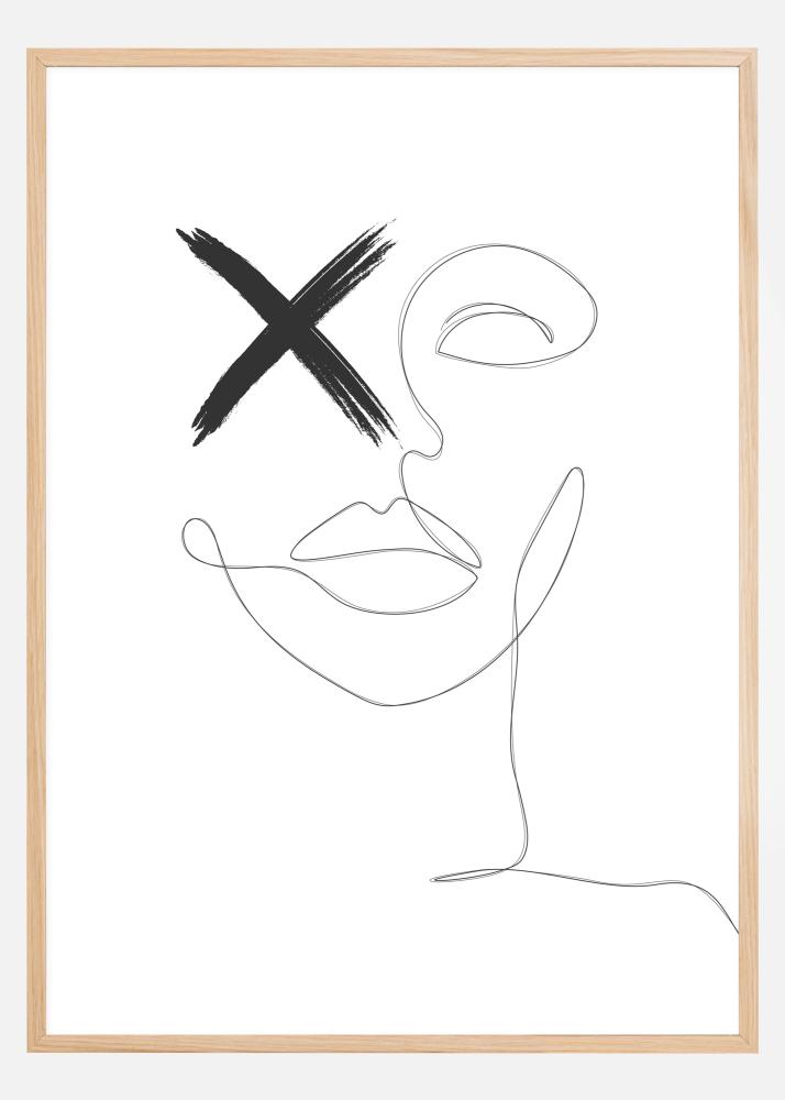 Um póster abstrato com um rosto desenhado com uma linha preta fina num fundo branco. A linha está conectada em um movimento fluido para desenhar o rosto. Sobre um olho, uma grande cruz preta está desenhada. Pendure-o numa parede colorida para ter um assunto interessante de conversa.