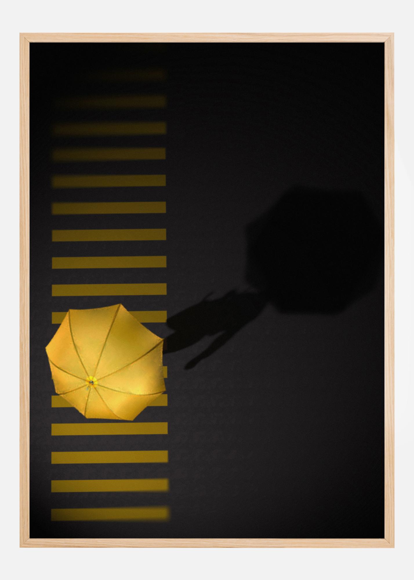 Uma imagem aérea de um pedestre com um guarda-chuva amarelo em uma faixa de pedestres. As linhas amarelas claras da faixa de pedestres são divididas pelo guarda-chuva amarelo colorido. A sombra do pedestre adiciona drama extra à imagem e torna a obra uma peça perfeita para decoração de interiores.