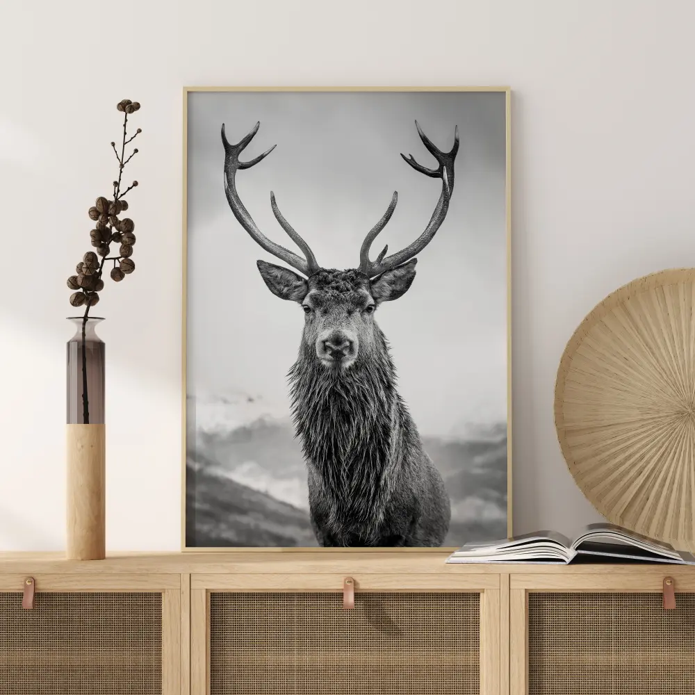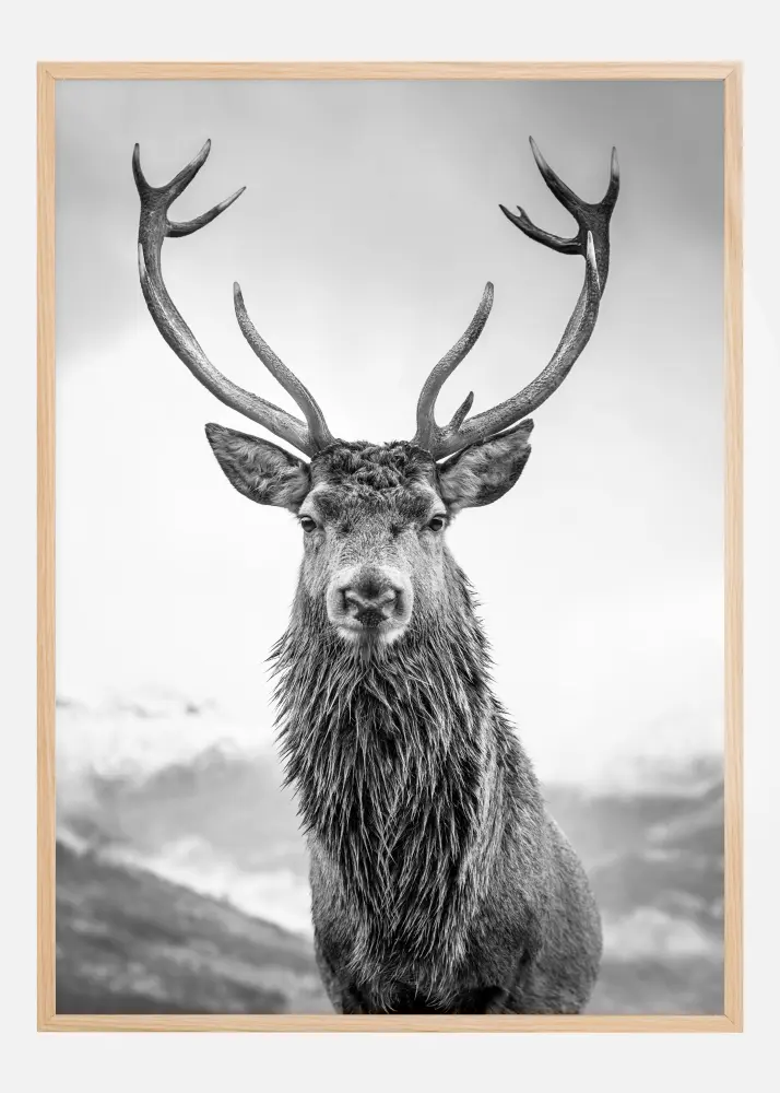 Um póster real com um cervo vermelho. O cervo curioso olha diretamente para a câmera com o seus chifres que se ramificam dramaticamente no céu nublado. Ao fundo, há colinas ondulantes. Esta impressão em preto e branco realmente ganha vida numa parede verde ou azul.