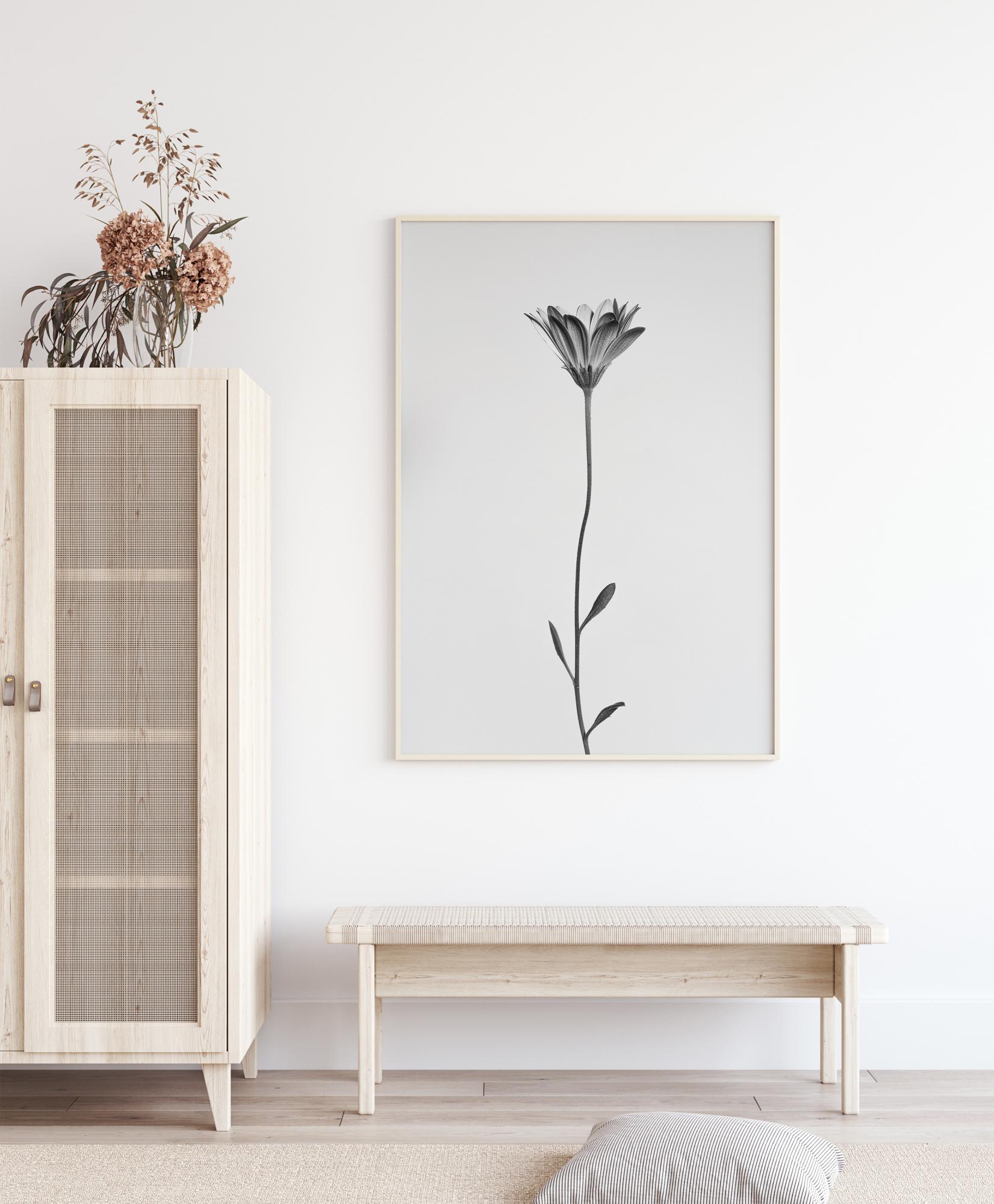 Um póster com um close-up de uma margarida longa num fundo branco puro. A elegância simples da flor é um complemento perfeito para a sua casa de banho ou cozinha minimalista.