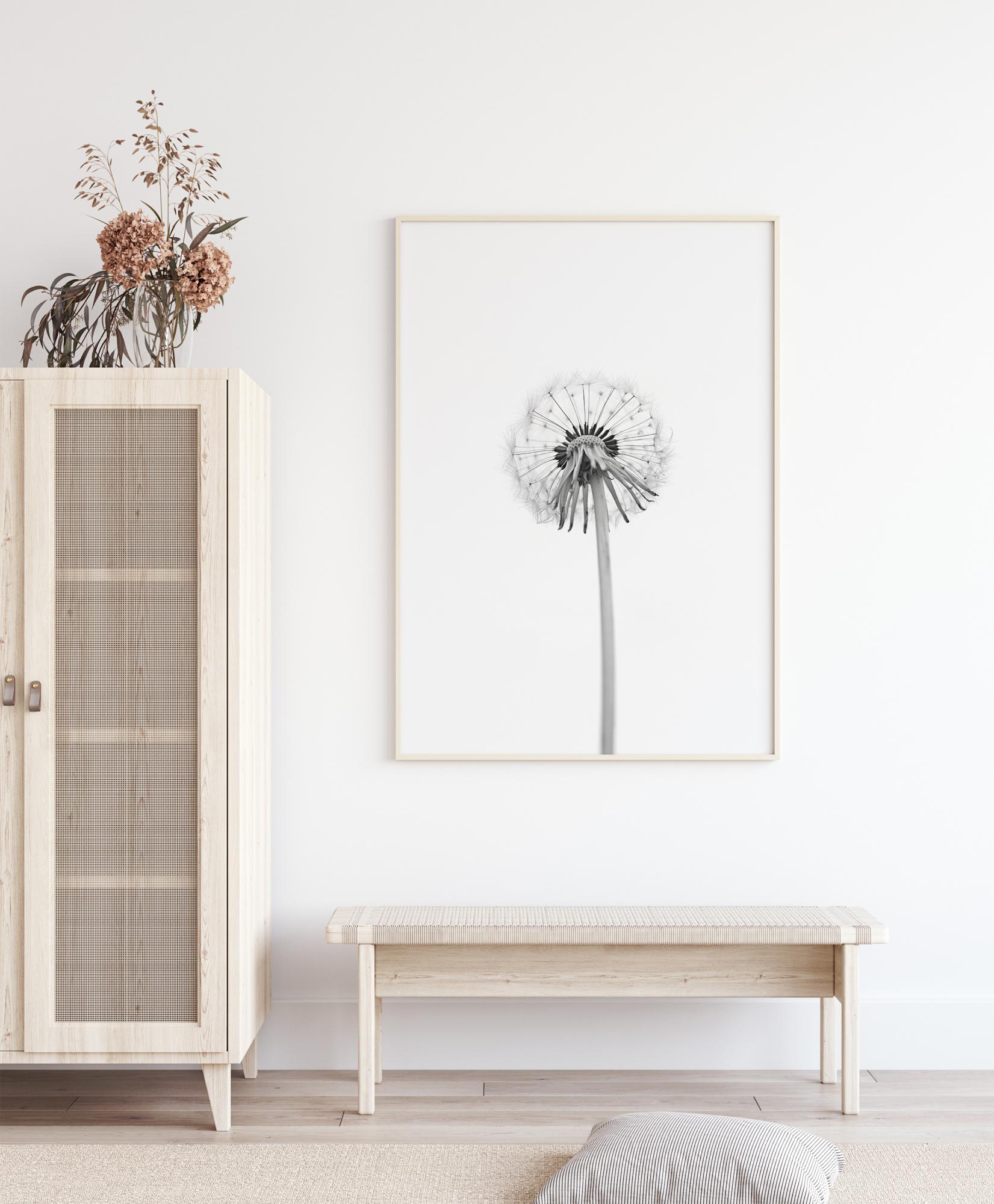 Um póster de natureza clara e limpa com um dente-de-leão num fundo branco. Esta imagem predominantemente branca se destacará numa parede azul ou verde vívido. Esta imagem é perfeita para uma galeria de parede.