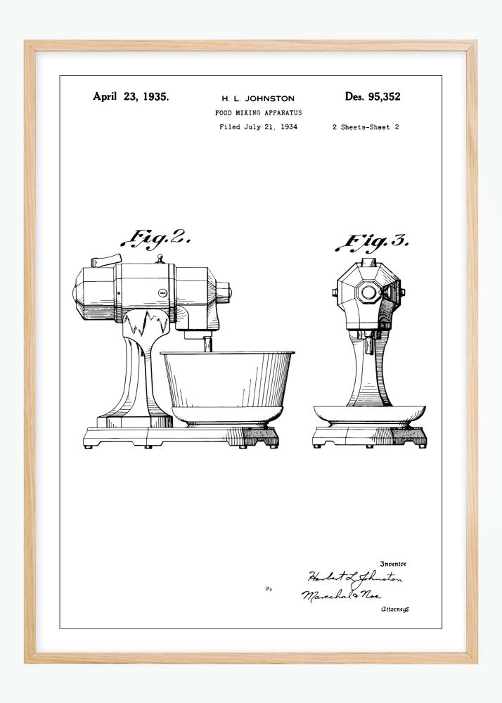 Este pôster de patente cuidadosamente detalhado representa um aparelho de mistura de alimentos, uma ferramenta essencial na cozinha que revolucionou a arte culinária. A patente, projetada por H.L. Johnston em 23 de abril de 1935, sob o número Des. 95.352, ilustra o design inicial de uma batedeira de pé, um utensílio doméstico que se tornou indispensável na culinária moderna. A figura mostra o aparelho em duas vistas, proporcionando uma compreensão abrangente de sua construção e função.