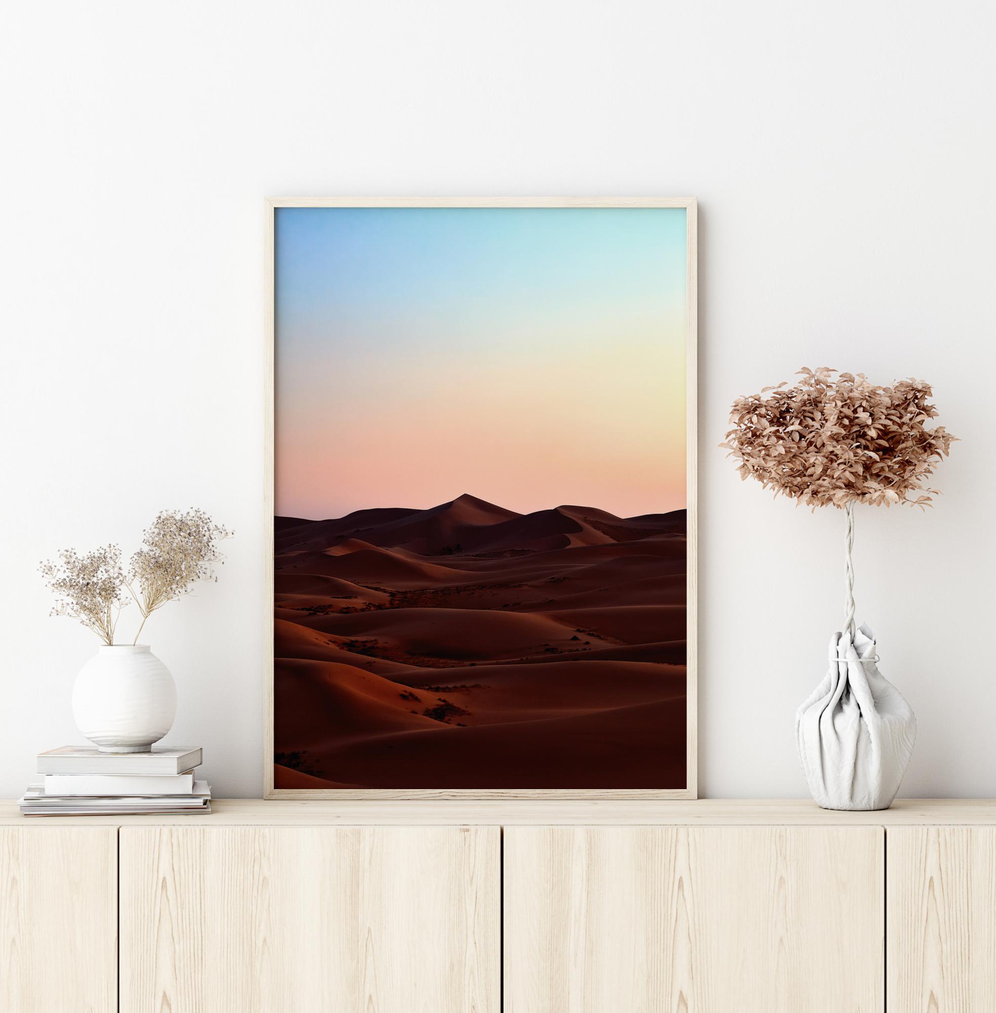 Um póster atmosférico com uma paisagem desértica. O profundo deserto vermelho destaca as dunas de areia ondulantes, levando o olhar através da paisagem. O céu suavemente azul e os borrifos rosados ??nebulosos dão uma sensação de manhã cedo. Aproveite as vastas extensões da natureza quando tiver essa imagem pendurada na parede.