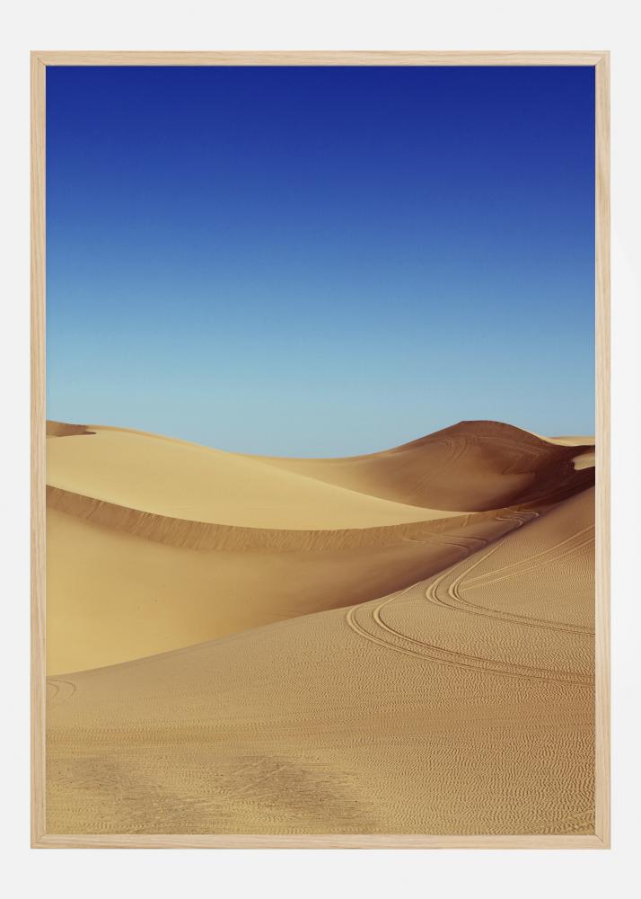 Um póster alegre com incríveis dunas de areia amarela com duas trilhas de pneus em uma curva. As dunas de areia claras são realçadas pela emocionante azulidade do céu. Perca-se na vastidão com esta incrível obra em sua parede.