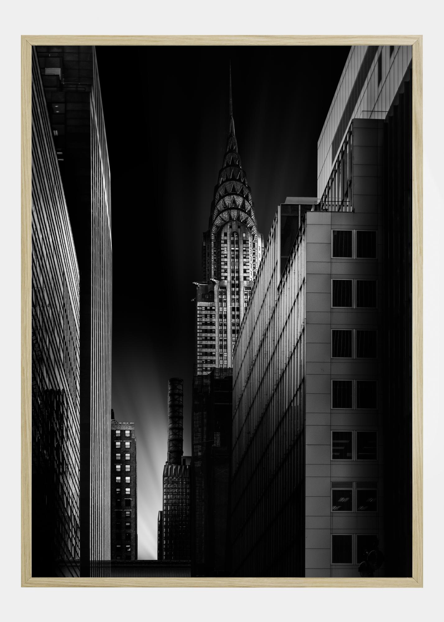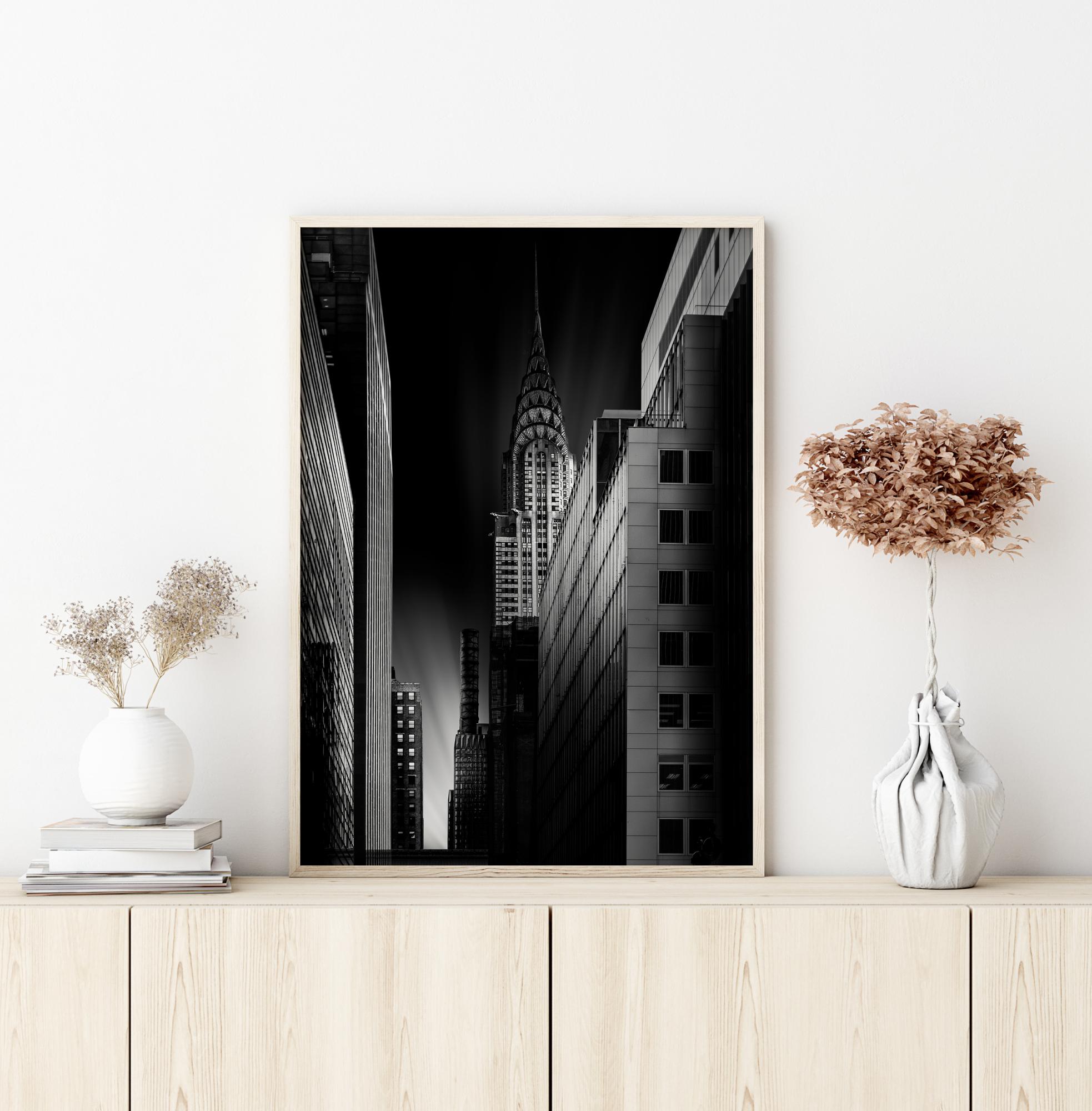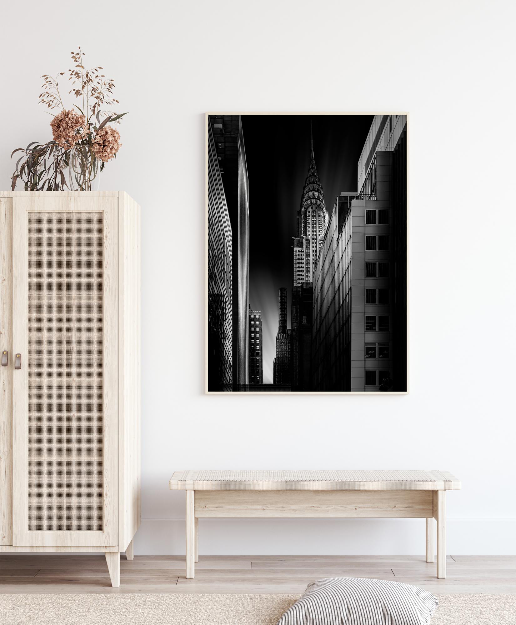 Um póster urbano com o prédio da Chrysler à noite. Uma rua estreita direciona o olhar para um raio de luz no céu. À direita, o prédio sombrio pode ser visto nesta foto um tanto assustadora. A imagem pendurada numa parede branca em uma galeria privada.