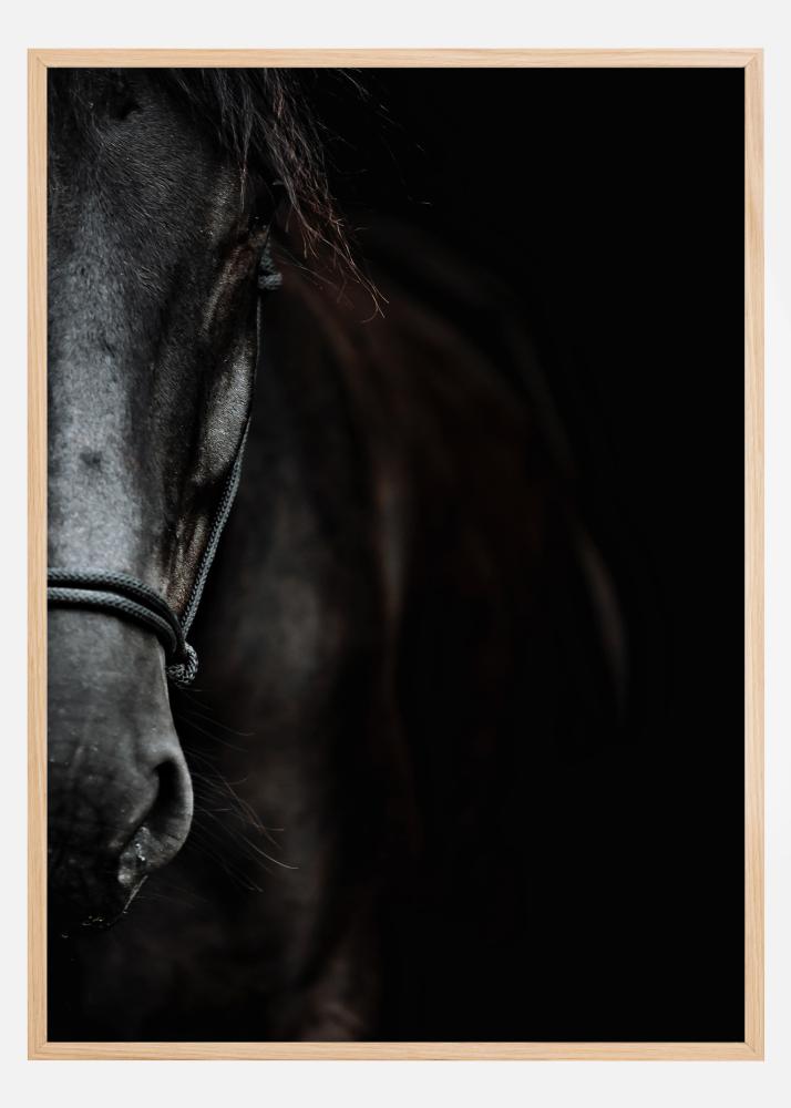 Um póster fotográfico para os amantes de cavalos! Aqui está um cavalo escuro fotografado de frente para um fundo escuro. O rosto está lindamente iluminado enquanto a parte traseira do cavalo se funde ao fundo. Complemente com algo da nossa ampla seleção de molduras.