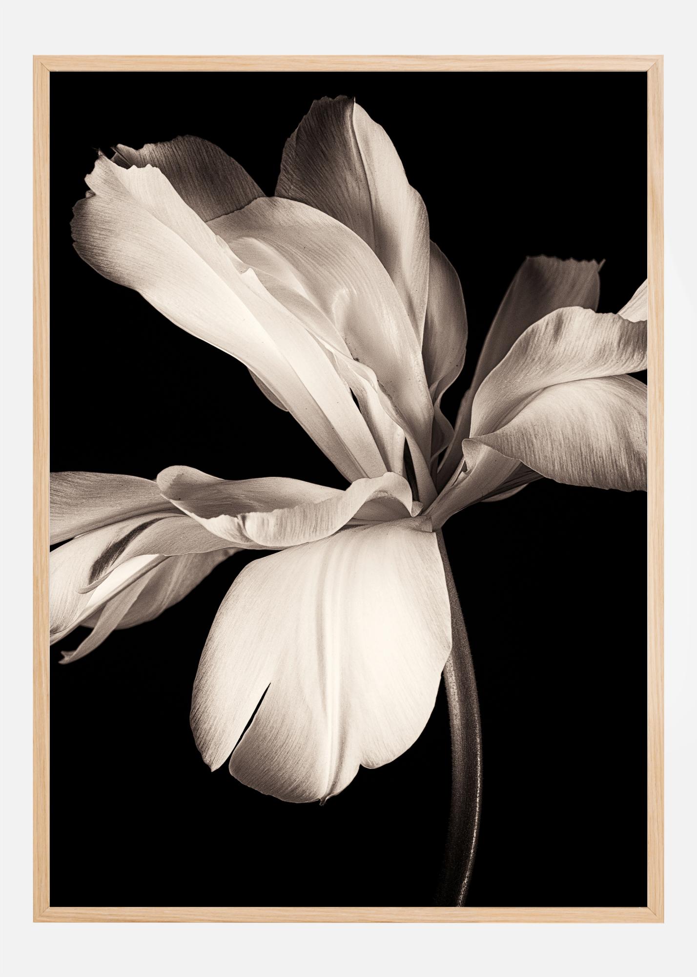 Um póster macro de uma flor e suas pétalas. A pétala branca suave e tenue se curva e dobra sobre um caule forte em direção a um simples fundo preto. A lente macro captura todos os detalhes e torna esta uma escolha perfeita para um entusiasta de flores. Admire os detalhes nesta imagem.