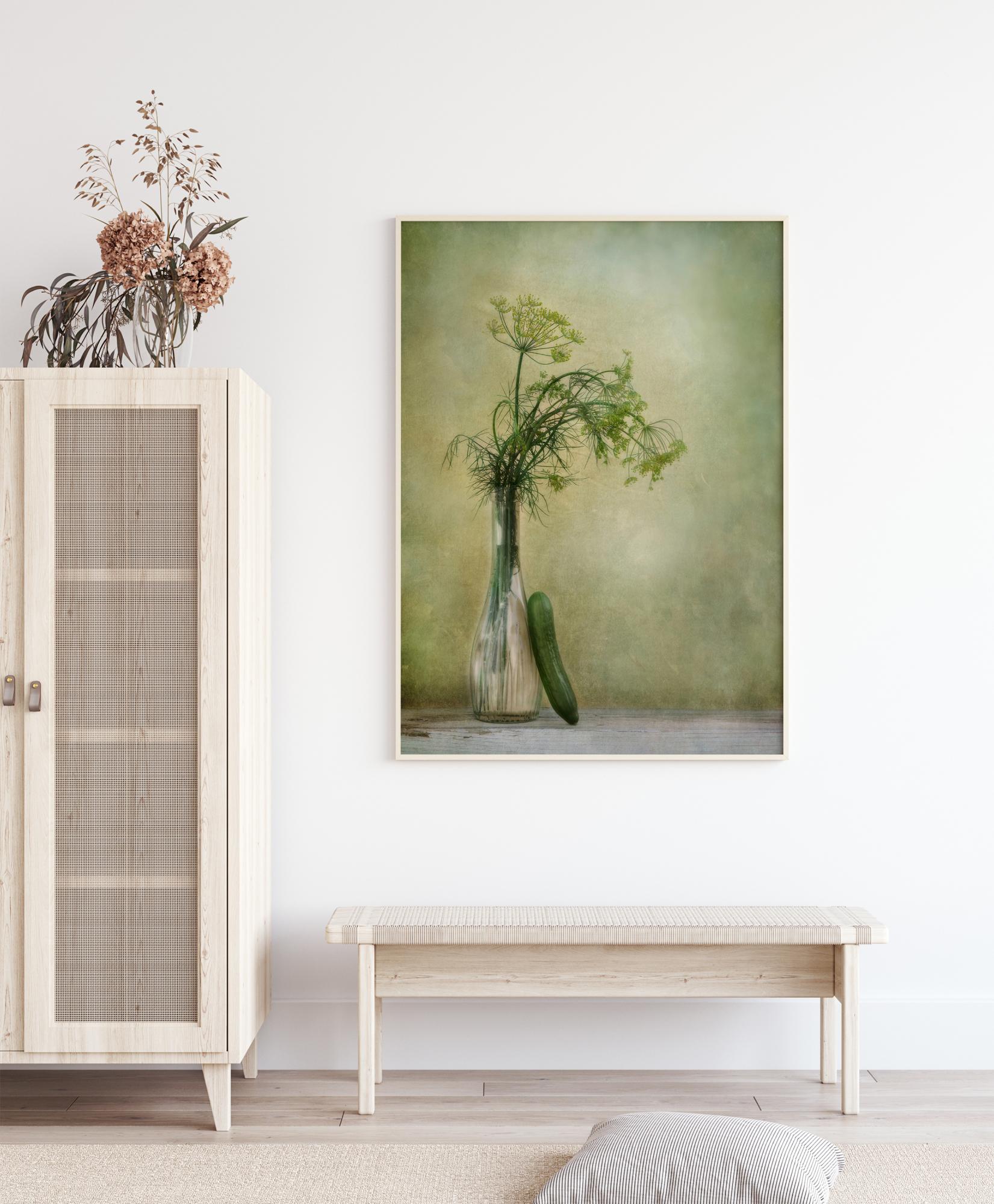 Um póster de vegetais com endro e um pepino e uma parede verde e amarela suave. O vaso de vidro segura o endro enquanto o pepino se inclina contra essa natureza morta. As aquarelas suaves ao fundo são mais claras ao redor das folhas, mas mais escuras nas bordas. Pendure esta obra em uma cozinha para uma sensação doce e vegana.