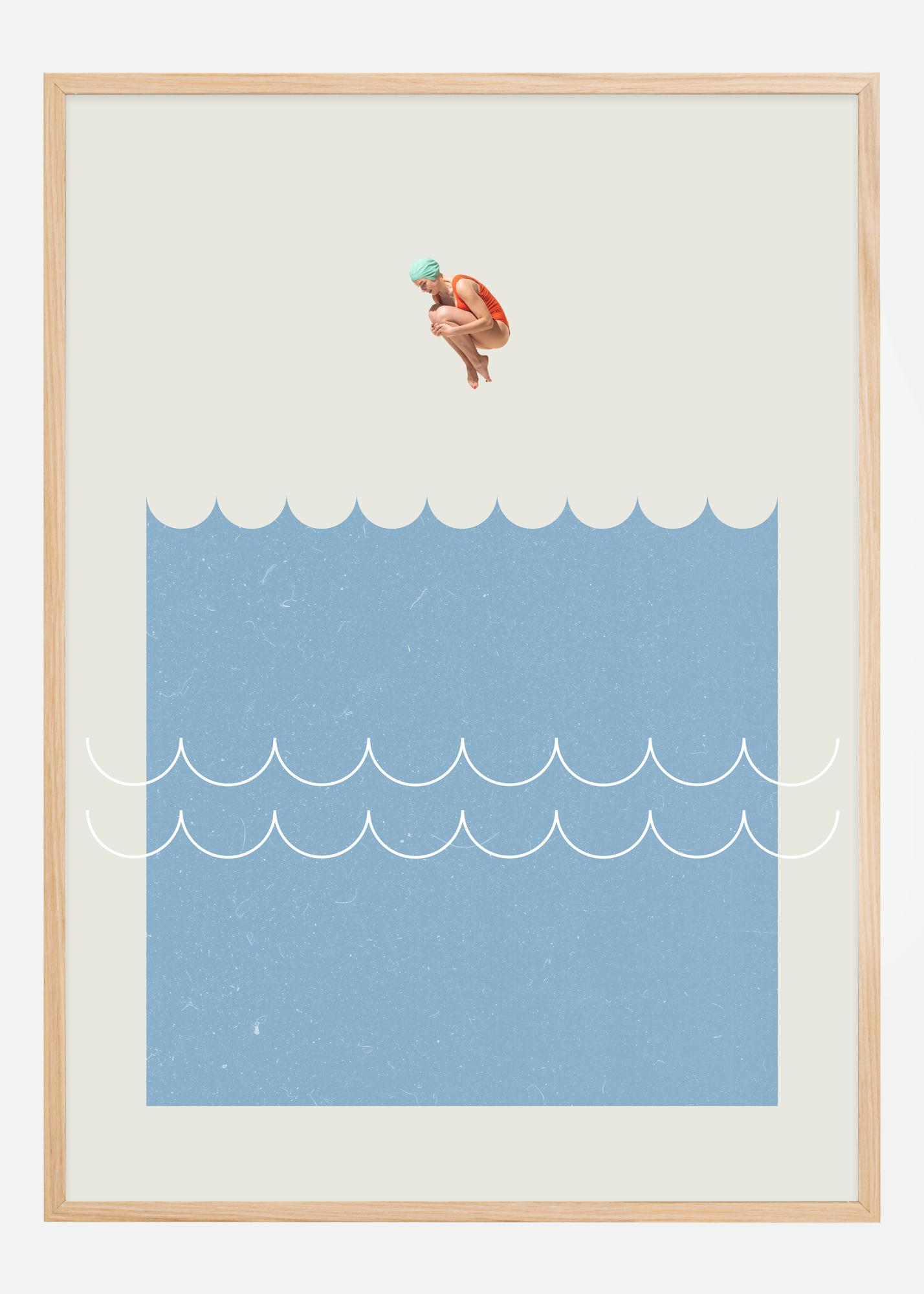 Este pôster é uma interpretação lúdica de um mergulho de verão, onde uma pequena figura em traje de banho e touca de natação é vista em queda livre em direção a uma ilustração estilizada de ondas. O design minimalista combina realidade com abstração, proporcionando uma perspectiva criativa e refrescante sobre o tema clássico de verão e diversão na água.