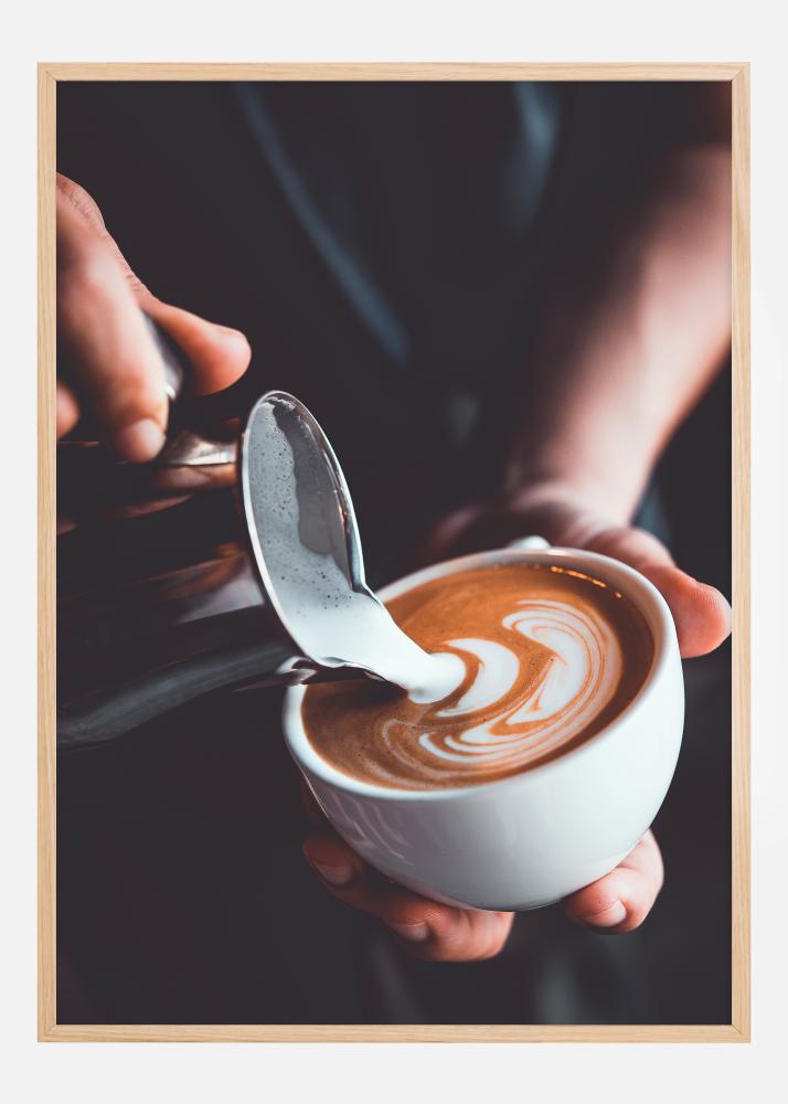 Este cartaz captura a essência do paraíso dos amantes de café com uma imagem de close-up de mãos criando o cappuccino perfeito. O tema mostra o artista por trás do barista em um ritmo quase de dança enquanto o leite é suavemente derramado para formar um delicioso padrão de coração na espuma. O fundo escuro do cartaz enfatiza os tons quentes do café e a superfície cintilante do exuberante leite, convidando a uma sensação de conforto e prazer.