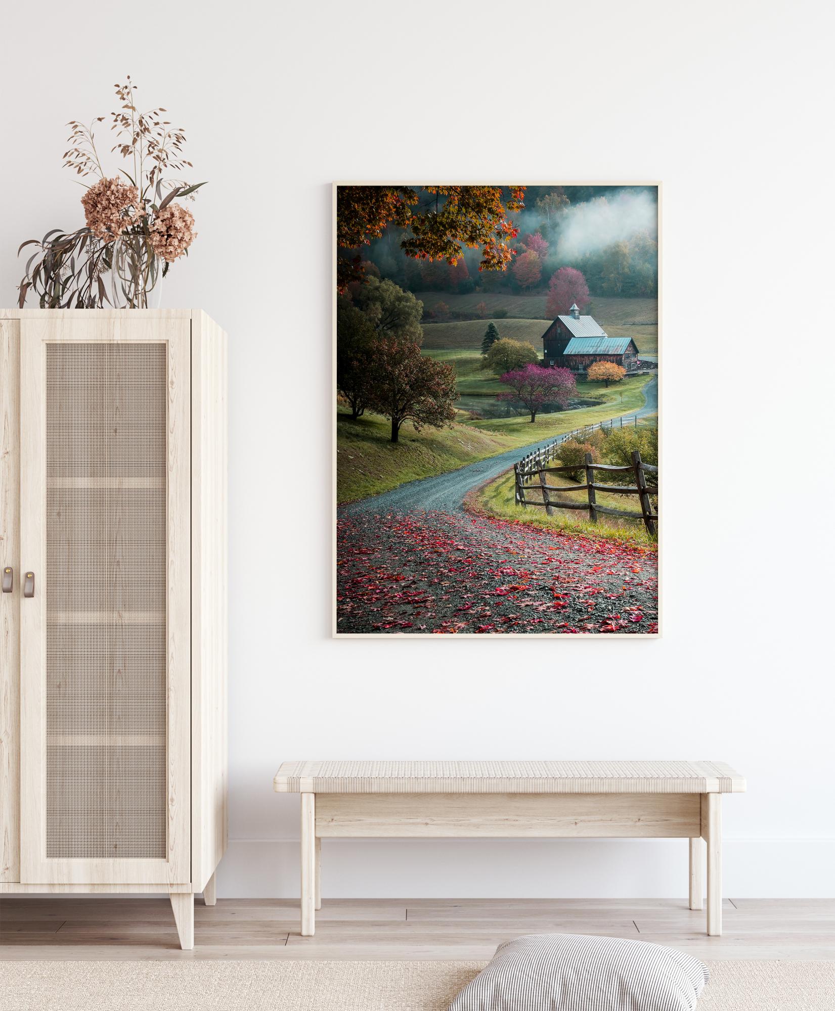 Um póster de natureza com uma paisagem rural com uma pequena estrada, uma fazenda idílica e árvores de outono. Folhas vermelhas estão espalhadas pela estrada que leva a um vale e à pequena casa. Um raio de sol penetra no vale e ilumina as folhas de outono na árvore. Sinta o encanto do campo ao pendurar esta imagem em casa.
