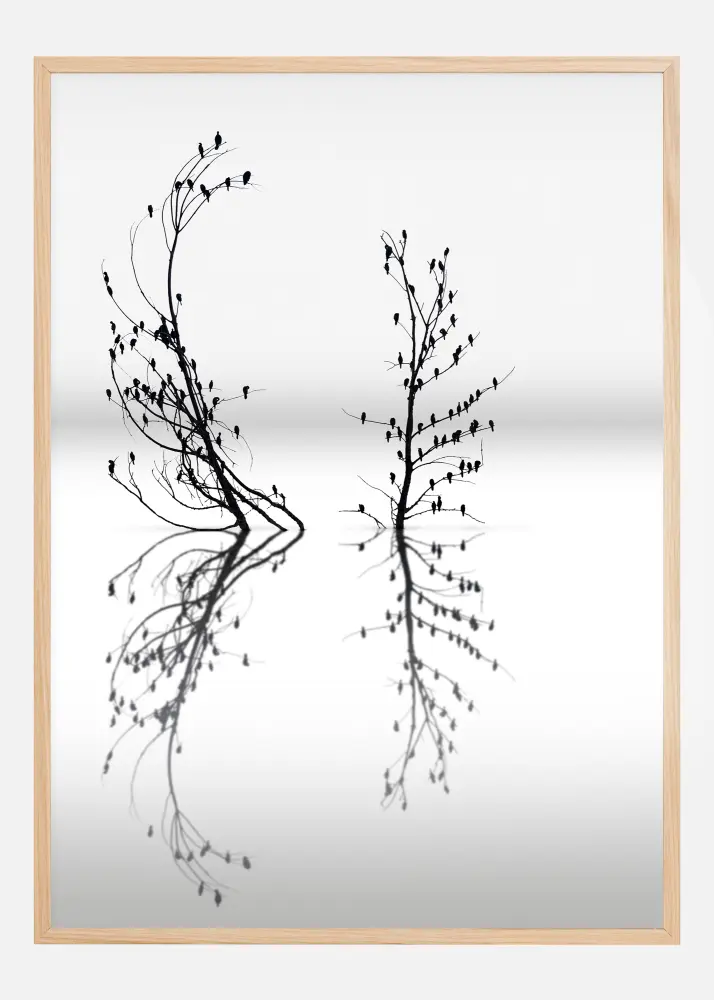 Um póster estilizado com dois galhos que emergem da água. Os galhos escuros, curvados e torcidos, lançam suas reflexões na água calma abaixo. As tonalidades azuis e brancas suaves nesta obra proporcionam uma atmosfera tranquila que pode desfrutar ao ter essa imagem na parede da sua casa.