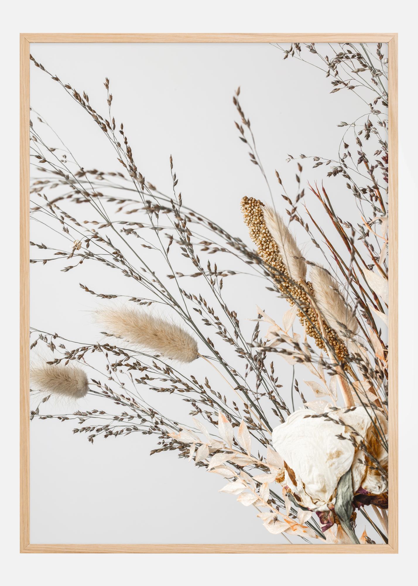 Este pôster é uma celebração da silenciosa elegância da natureza, apresentando uma variedade de plantas secas. A composição natural é cheia de linhas finas e formas orgânicas, desde os grãos ondulantes até as espigas robustas e as folhas sutilmente coloridas. A paleta marrom-bege das plantas secas contra o fundo branco puro proporciona uma sensação de calor e natureza capturada em quietude.
