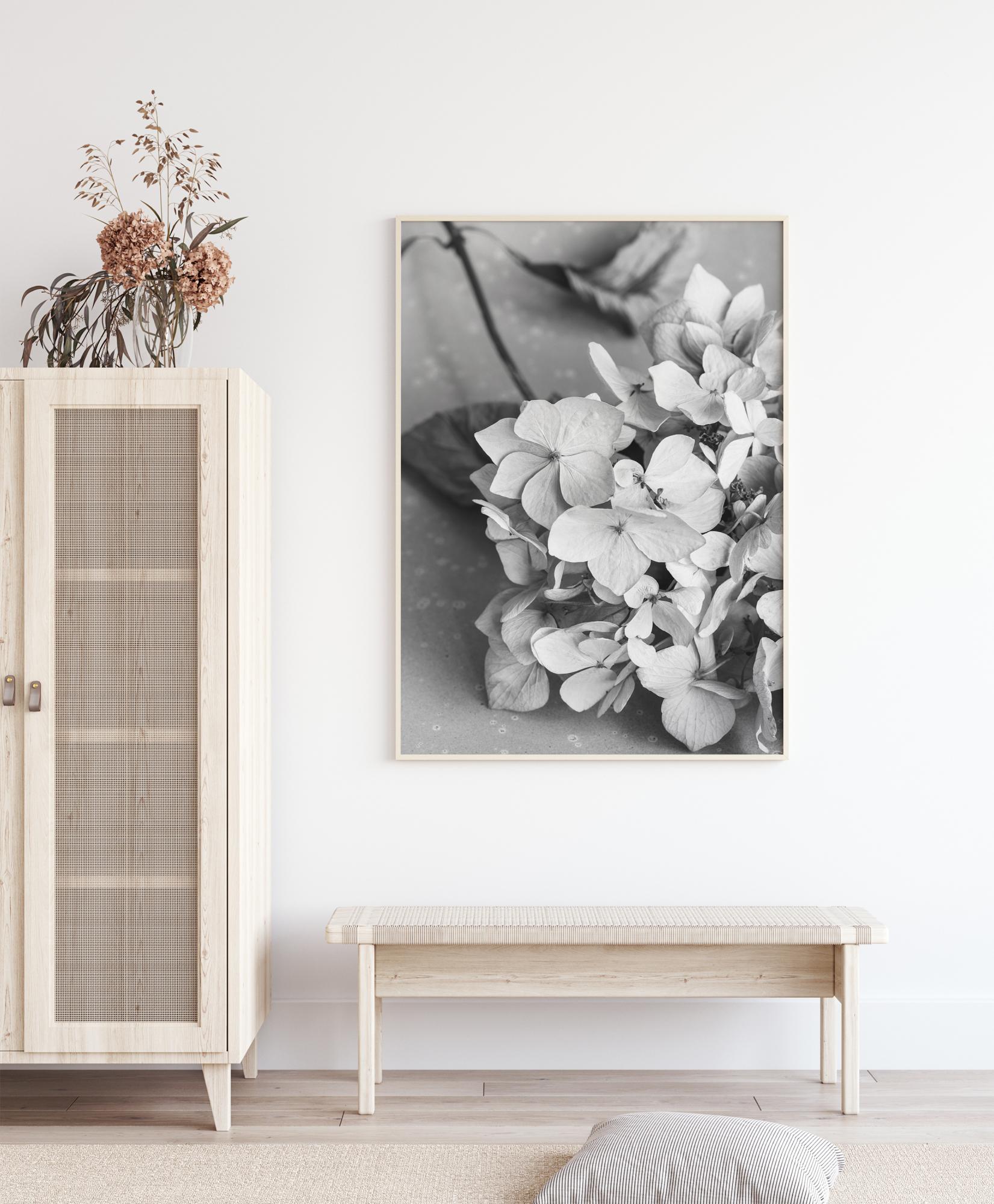 Um póster de flores que mostra várias flores brancas secas, todas em cima de uma mesa. As grandes pétalas brancas parecem frescas e bonitas em contraste com as folhas secas e enroladas abaixo. Combine esta obra com uma parede de cor ousada para dar a ilusão de cor nas pétalas e fazer com que este póster se destaque.