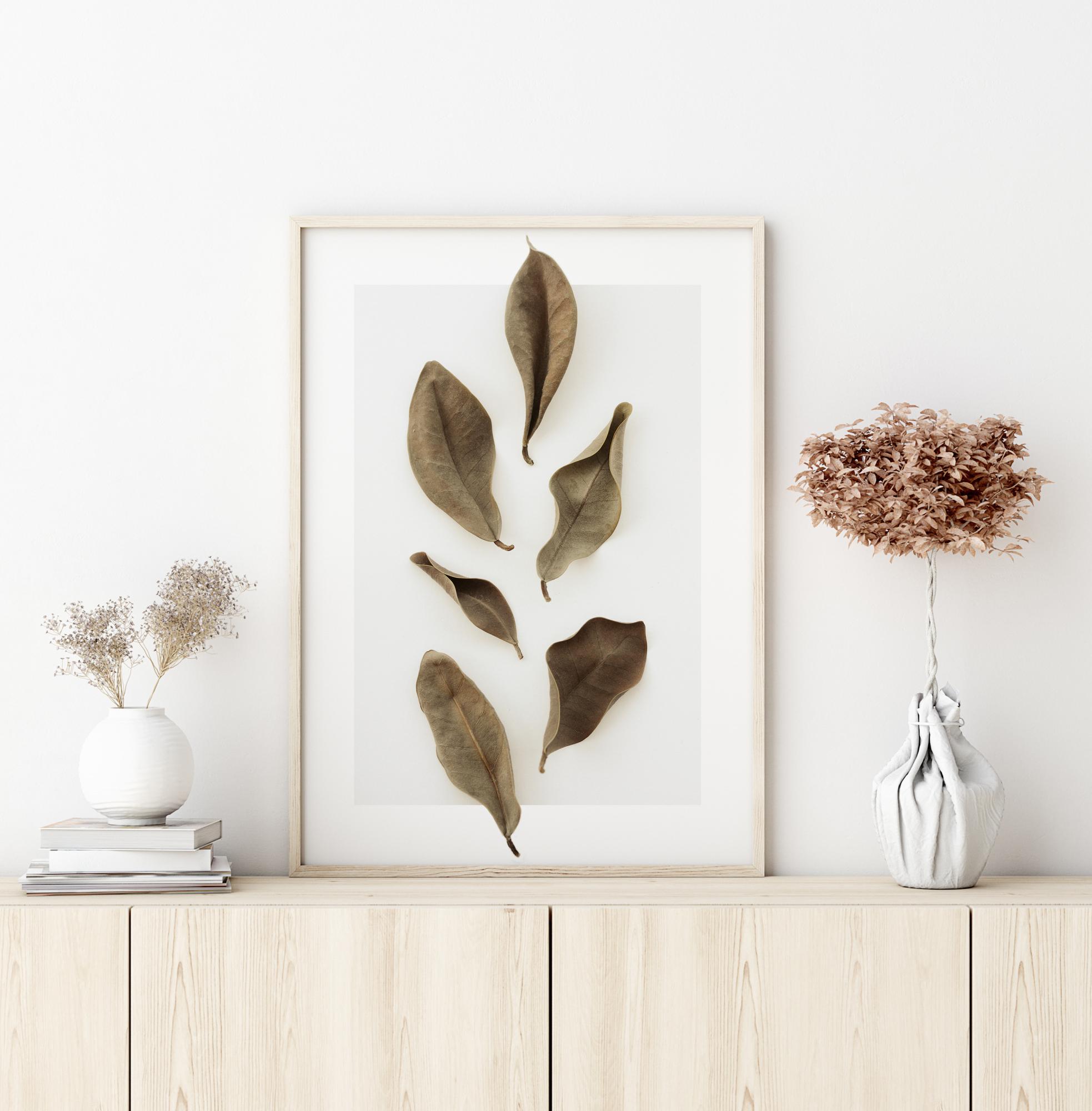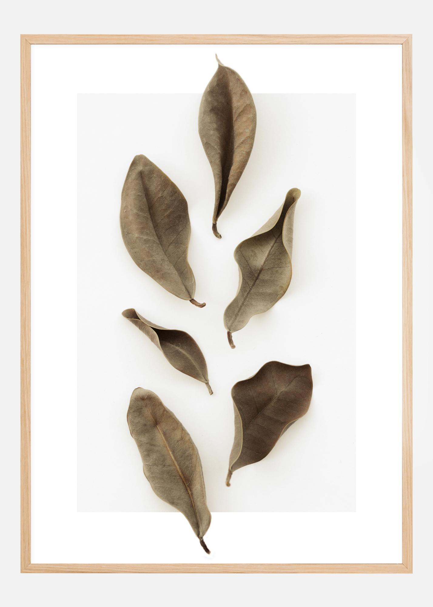 Um póster detalhado com folhas secas. Seis folhas secas estão dispostas como se ainda estivessem presas a um galho num fundo branco. As folhas marrons são simples e comuns, perfeitas para realçar uma parede vívido ou adicionar padrões a uma simples.