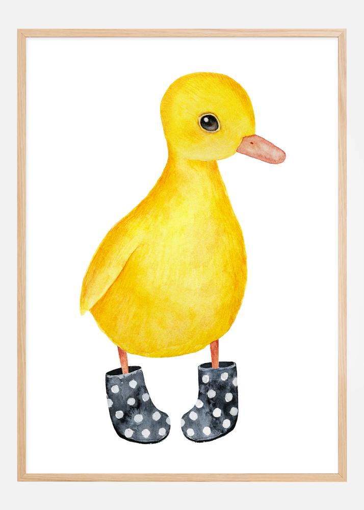 A cor amarela brilhante do patinho ilumina-se contra o fundo neutro e as galochas pretas com bolinhas brancas adicionam um contraste lúdico. Este quadro possui uma simplicidade que é tanto atraente quanto atmosférica, tornando-o um presente ideal ou um toque de cor necessário na sua decoração. Com seu charme atemporal e esquema de cores impressionante, esta é uma impressão que será apreciada por muito tempo.