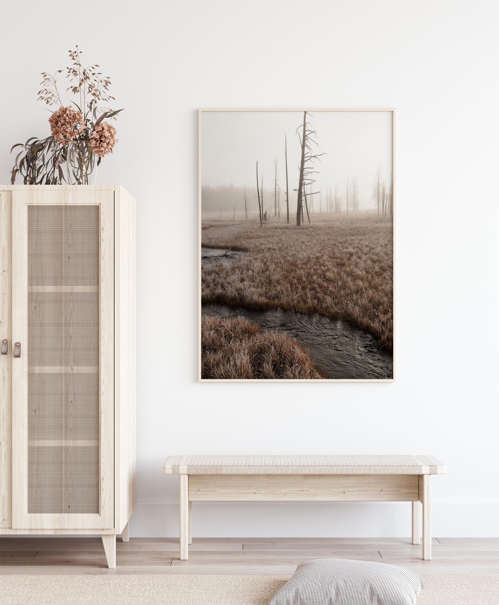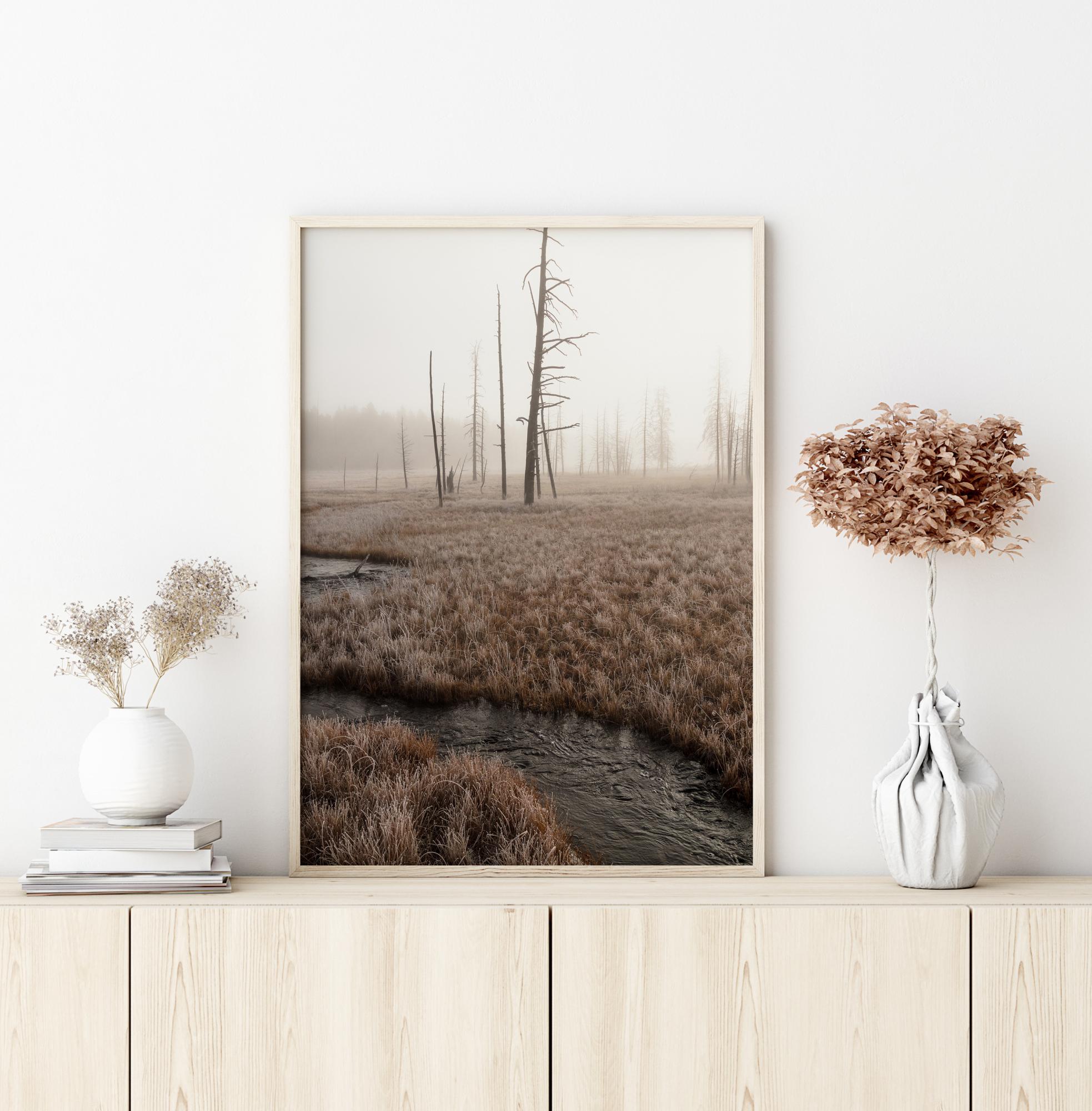 Um póster de paisagem sobrenatural com uma planície de árvores mortas e um rio que corre por ela. Nesta foto de manhã cedo, a névoa envolve as árvores e a grama amarela. Siga o rio enquanto ele serpenteia pela paisagem até a floresta distante. Perca-se em um tempo e lugar diferente quando pendurar isso.